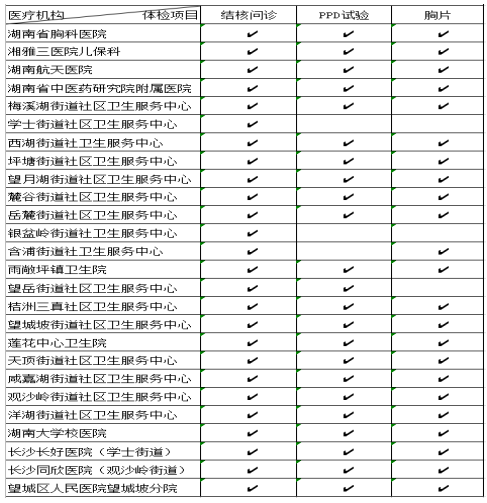 岳麓区2020年可开展新生入学结核病检查医疗机构名单: