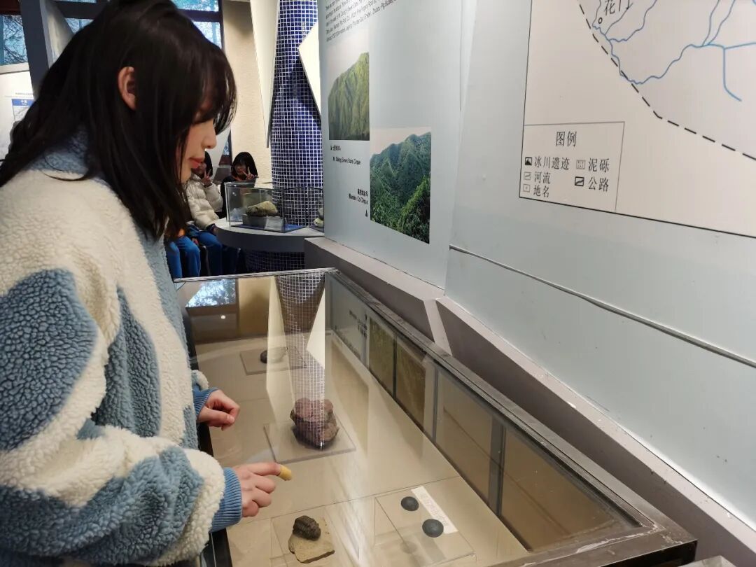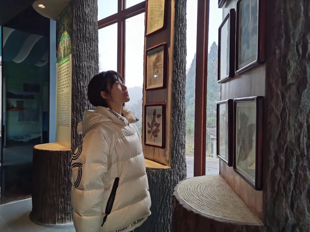 山水无意,却惹人醉。唐有杜牧《山行》且慢慢,驻足赏枫林;今有诗意山行,亦能一览苍松翠竹、山水精妙。沿着盘山公路绕行而上,穿行在山林鸟鸣中,满眼都是望不尽的绿林,偶有一株似火红枫、金黄银杏惊醒了朦胧睡眼。原来冬日的山林却也是这般多彩,红黄点缀在满山苍绿中。坐在大巴中,一路昏沉,只能轻鸢剪影般的扫过车窗外的风景。山腰酒店即到,虽没有想象中那么雅致,但这一点失落早已被同行的欢畅冲淡,忽略不计。上午抵达山腰酒店,实践团稍作休整就前往地质博物馆,通过观察标本了解大围山第四纪冰川地质特色,然后分小组进行自然植物观察活动。学生拍照记录,并制作植物标本。