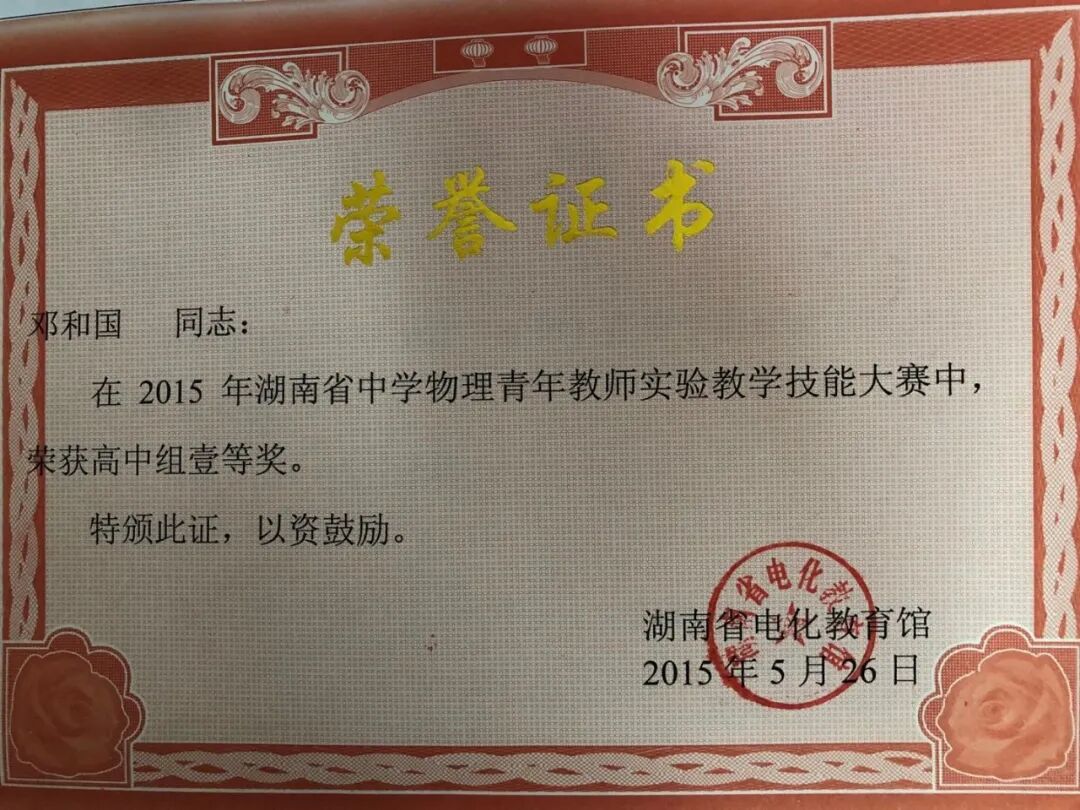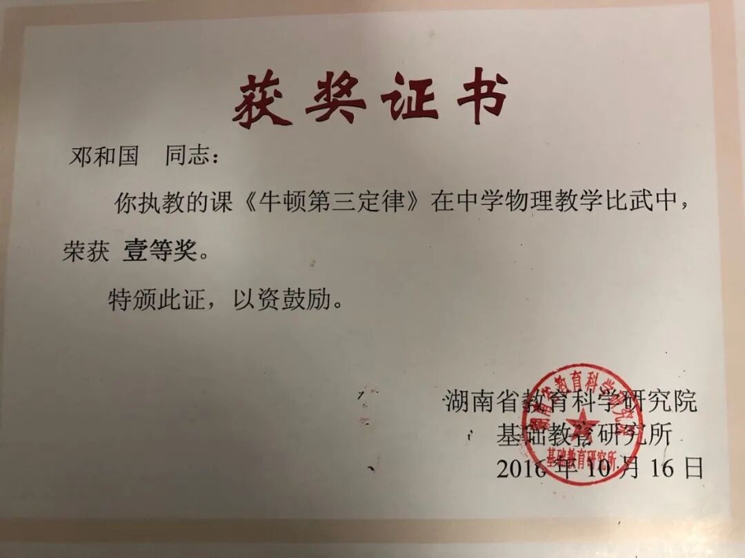 打开邓和国老师的以往履历,他突出的教学业绩赫然映入眼帘。参加工作以来,邓和国老师在省级以上刊物发表论文16篇;出版教育专著一部,参与编撰教辅用书2本;主持课题研究2项、参与课题研究4项;获市一等奖以上各种教学业务竞赛奖励 21次。先后获评“全国基础教育课业改革先进工作者”、“基础教育科研尖端人才”、“中国发明协会中小学创造教育分会先进工作者”、“省优秀教师”、“市优秀教师”、“市物理学科带头人”、“市名师”、“奥赛优秀指导老师”、“县优秀教育工作者”、“县优秀班主任”等称号。他还被聘为湖南省“一师一优课评审专家”、永州市“督导评估专家”。