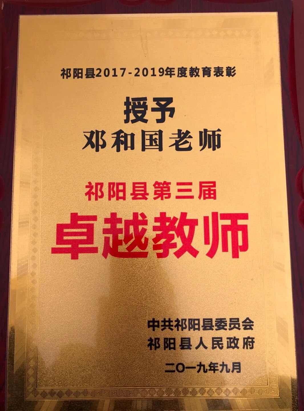 从教以来,他担任了20年的班主任工作。在班级管理工作中,始终坚持两大理念:一是致力于学生自主管理模式的运用和发展;二是致力于情感育人模式的研究。邓老师不断学习青少年心理学理论,研究当代青少年学生的心理状态。以爱字当头,倾听学生的心声,用情育人。坚持“六管齐下”的管理原则,从学习、生活、思想、家庭、经济、情感等方面去无微不至地关爱学生。一份耕耘,一份收获,他也因此多次被评为县、校级“优秀班主任”,所带班级多次被评为“优秀班集体”。特别是他在祁阳一中带领的619班,培养了四名北大清华学子,最低分628分,他本人也被称“史上最牛班主任”。该班从最初的组建筑梦、到历时三年的奋斗追梦,再到圆梦高考完美收关,邓和国老师倾尽心血,耗尽精力。