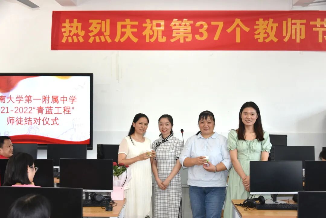 第三个主题是今年的新的师徒结对拜师仪式。在全体老师的共同见证与祝福下,今年新引进的青年教师肖俊红老师和陈烨老师分别与石秀老师和刘勉老师成功结对并签署了“青蓝工程”协议书,在签署协议书之后,徒弟们给师父行献茶礼正式拜师。