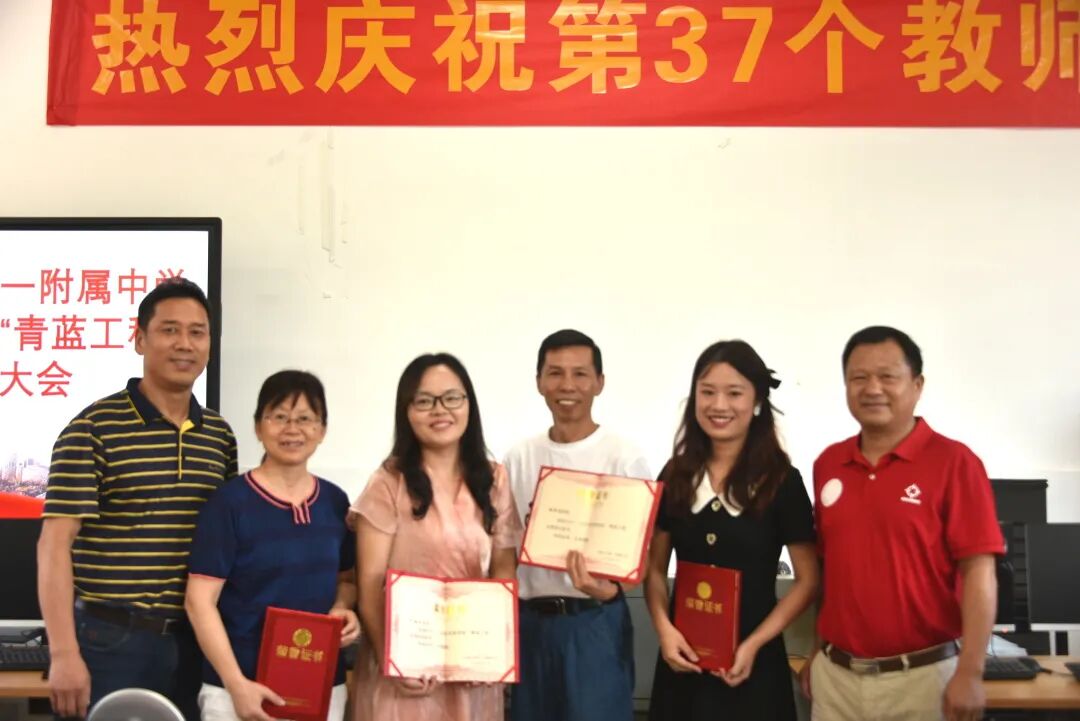 在蒋校长致辞之后,学校对2020--2021学年度学校“青蓝工程”的优秀师父:杨再杏老师与章秋香老师,优秀徒弟杨潇老师与卢燕玲老师给予表彰,并由陈道谦校长和刘西亮书记为他们颁发证书。