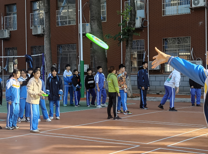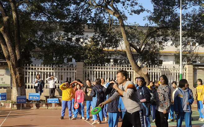 再到第二个比赛项目飞盘接力时,不少同学都表示是初次接触这个运动,不太清楚其中规则。于是易翀云老师特别邀请陈道谦校长为同学们做示范,两位老师你来我往,你投我接,同学们很快便对这项趣味运动产生了极大兴趣,争相比试。正式比赛时,只见参赛的同学迅如利剑出鞘,看的场外热情观众称赞连连,最终163班喜提冠军一枚。