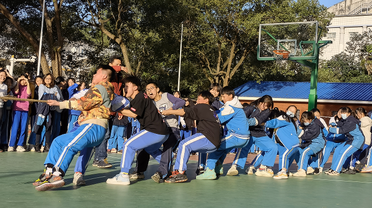 轮到最后一个压轴项目,拔河比赛时,同学们的热情将活动推入高潮,学生呐喊加油、老师齐齐努力,操场的氛围更加活跃。参赛的同学看着紧张,其实他们的班主任更紧张,不停地指挥这个、指点那个,恨不得自己上场比赛。经过一番角逐,C161班披荆斩棘,夺得冠军,C164班获得第二名,C162班和C163班并列第三。