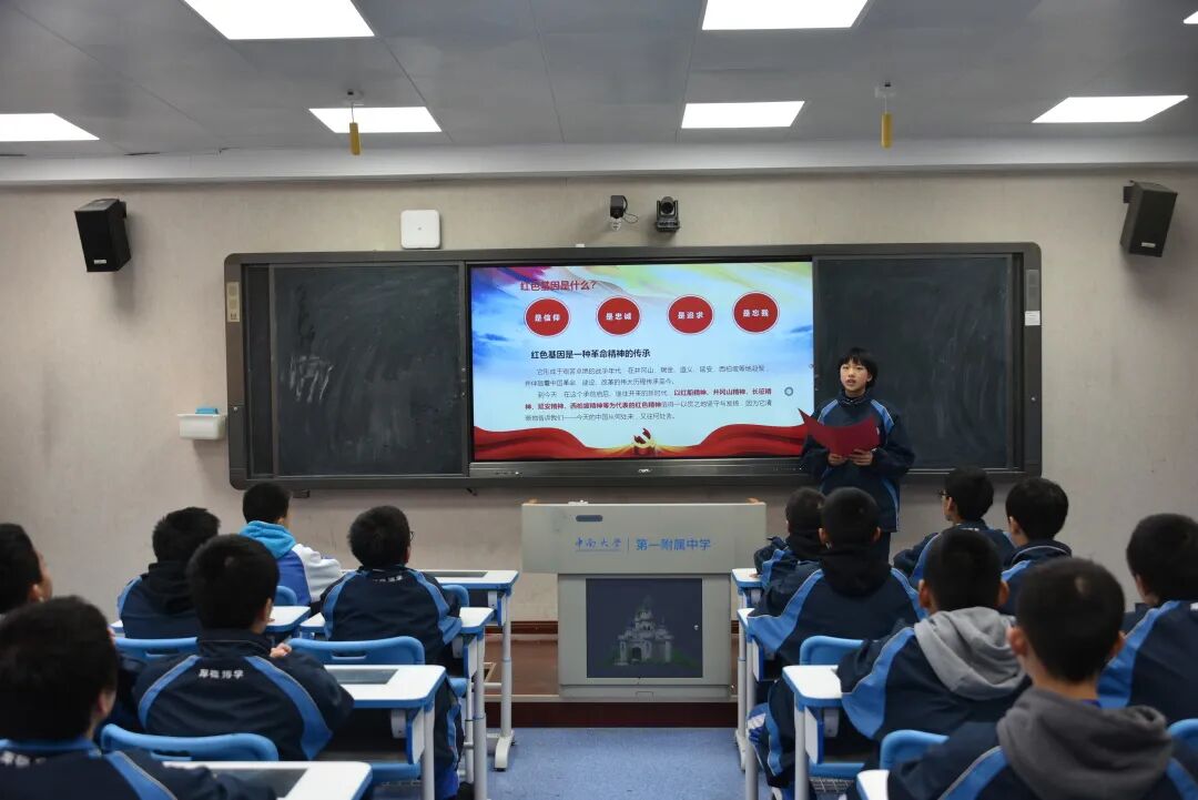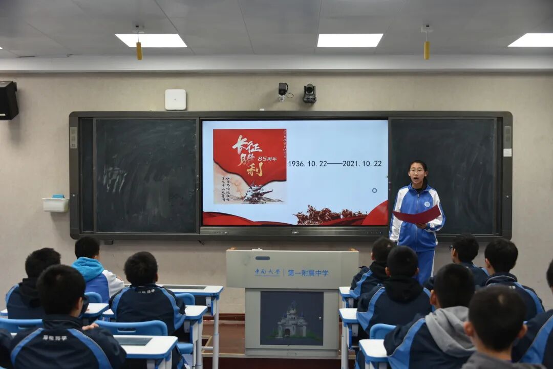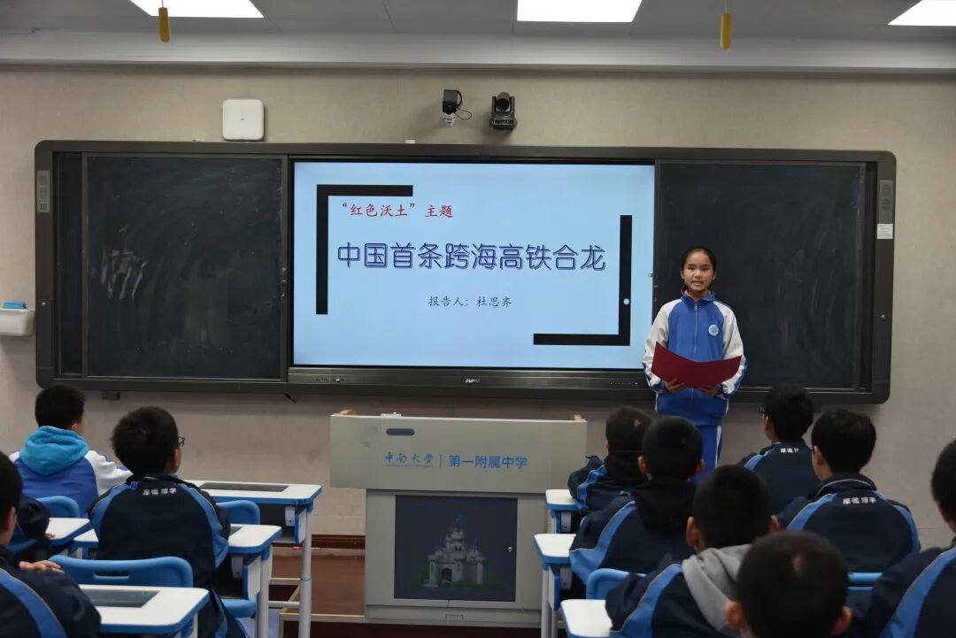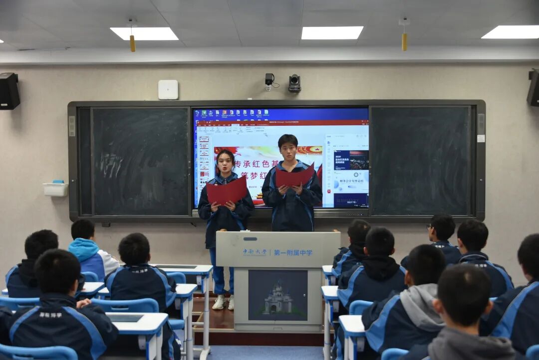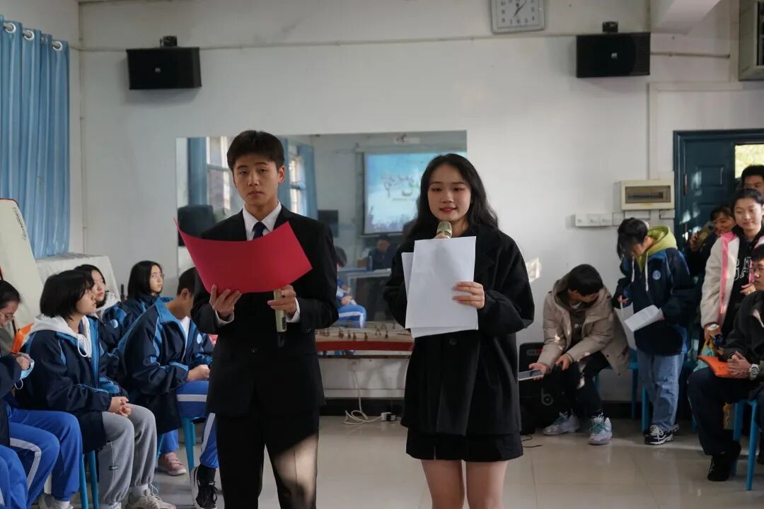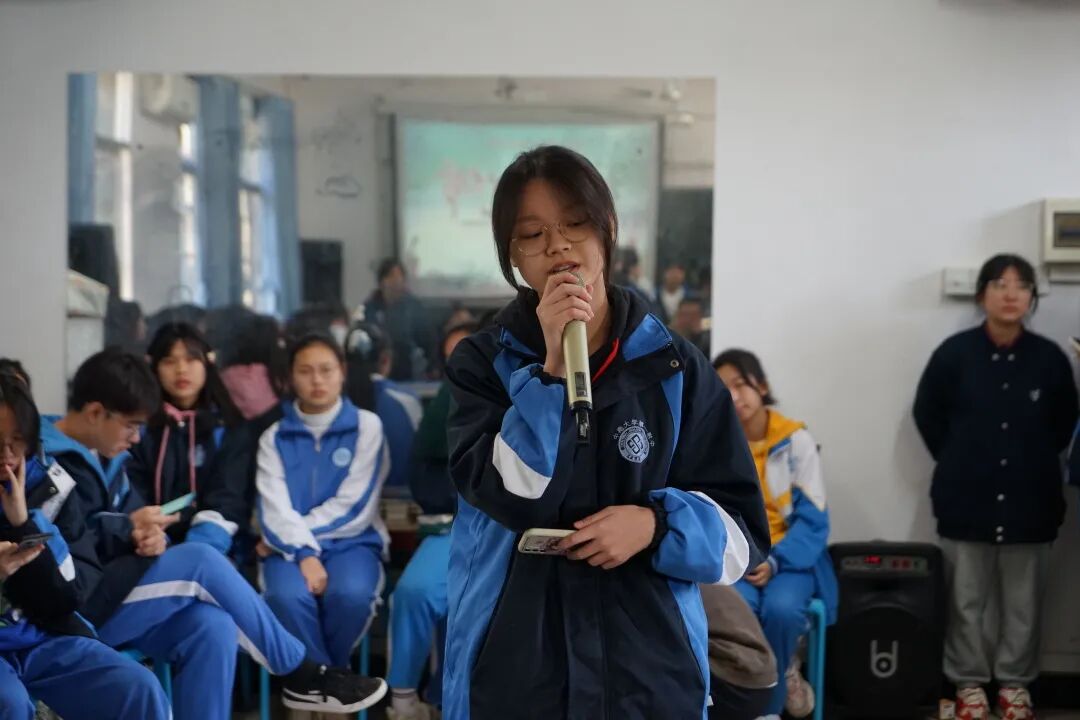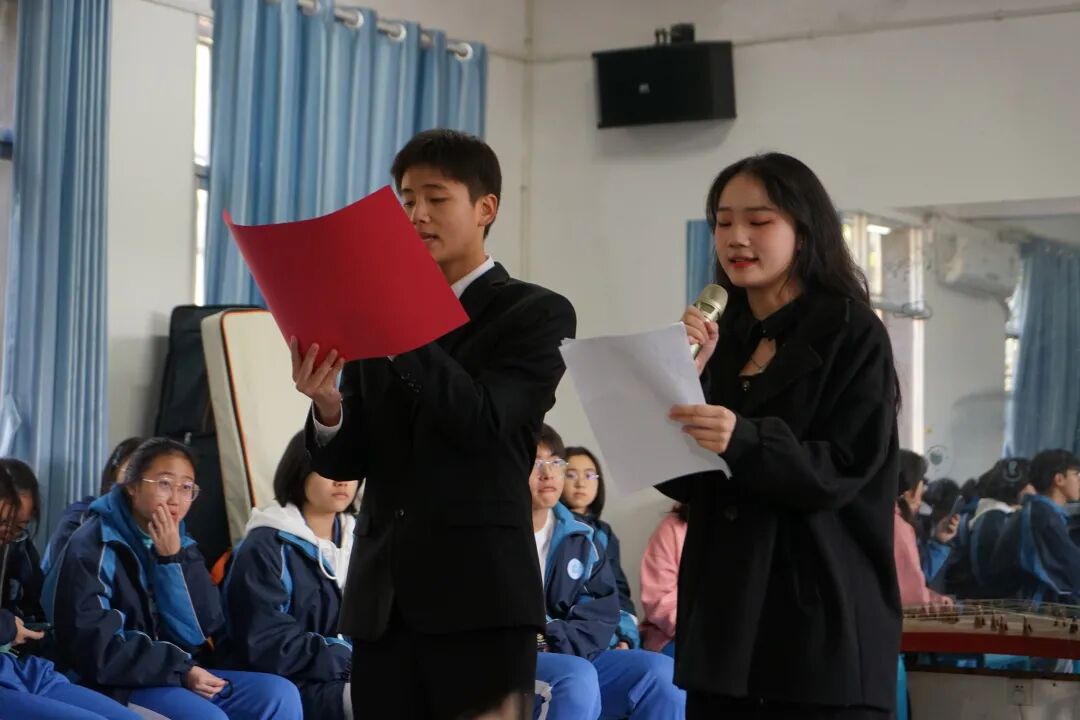决赛中,学生们围绕着“红色沃土”这一主题精彩纷呈地展示自己的作品,与全校师生分享了一道丰盛的精神大餐。从传承长征精神、传承红色基因到首条跨海高铁合拢、神十三的升天到北京冬奥场馆的黑科技等无不体现了在中国共产党的领导下中国人民从此站起来、富起来了,中国正在走向强起来的新征程中。在新征程中,青少年要肩负怎样的历史使命?正如高二年级的熊珊玲、张佳纯同学所说:“奋斗百年路启航新征程,请党放心,强国有我!”这一铿锵有力的誓言,使现场气氛达到了顶峰。
