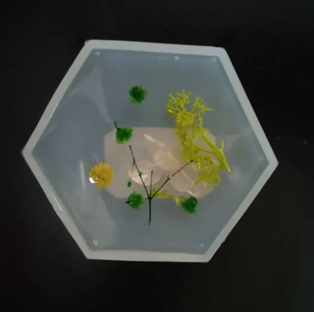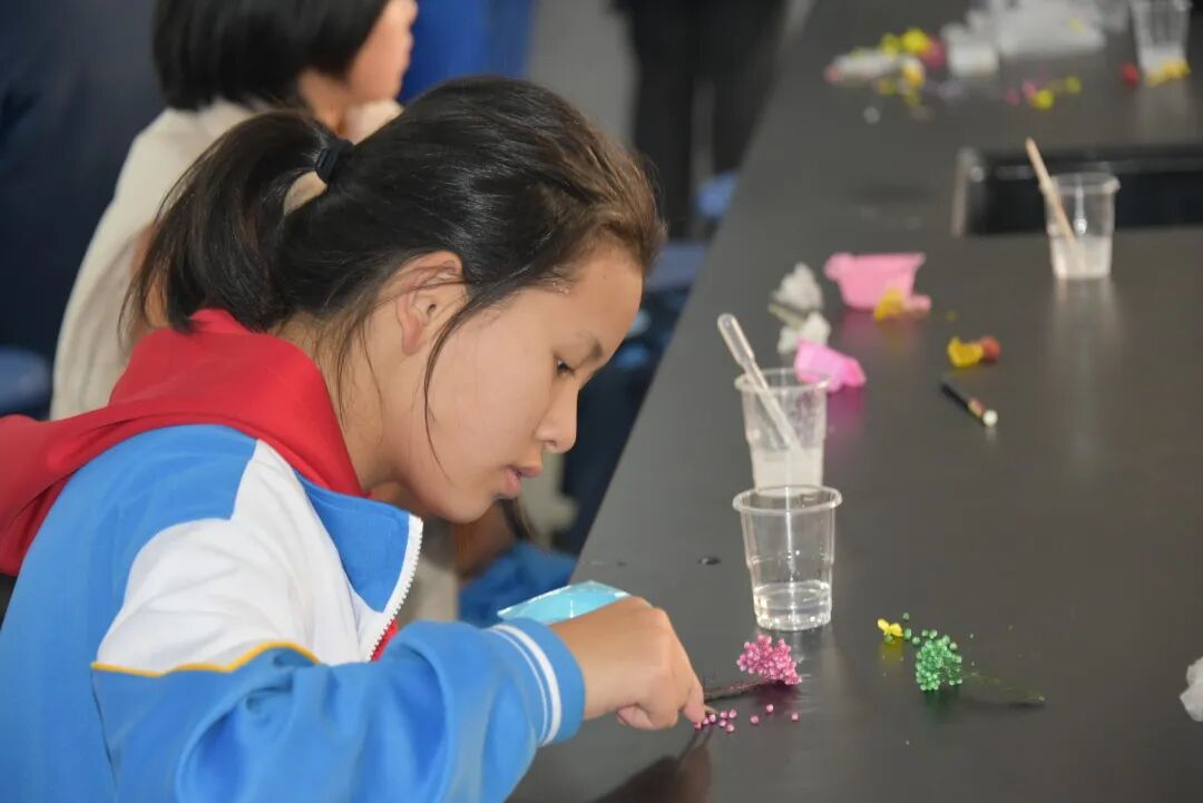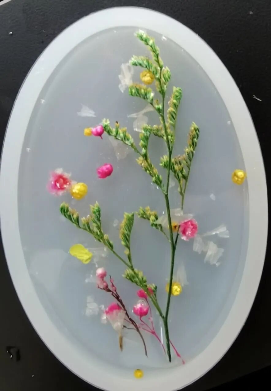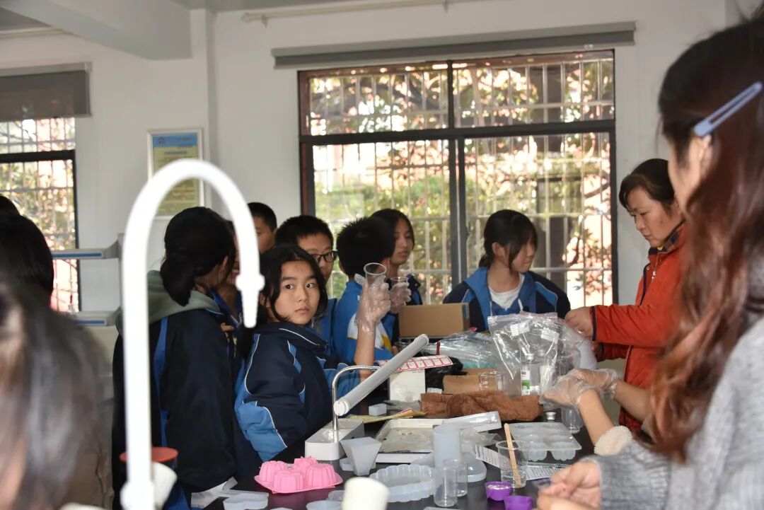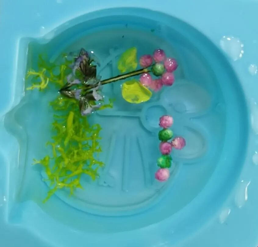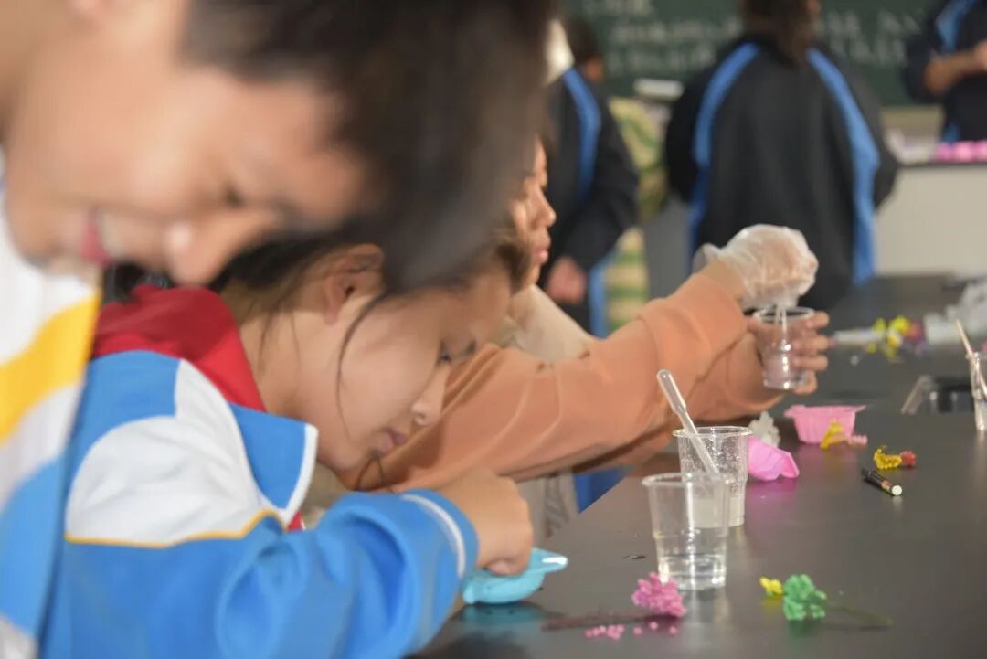 老师给学生提供了若干花材和超清滴胶,成品的制作需要学生将A胶B胶混合均匀,优质的混合胶无气泡,干净清澈如水,非常多的同学都做到了,制作过程体现了学生非常强的动手能力!准备好胶水后的倒模过程则体现了学生的审美能力和创造美的能力,所有的学生作品均来自学生的原创