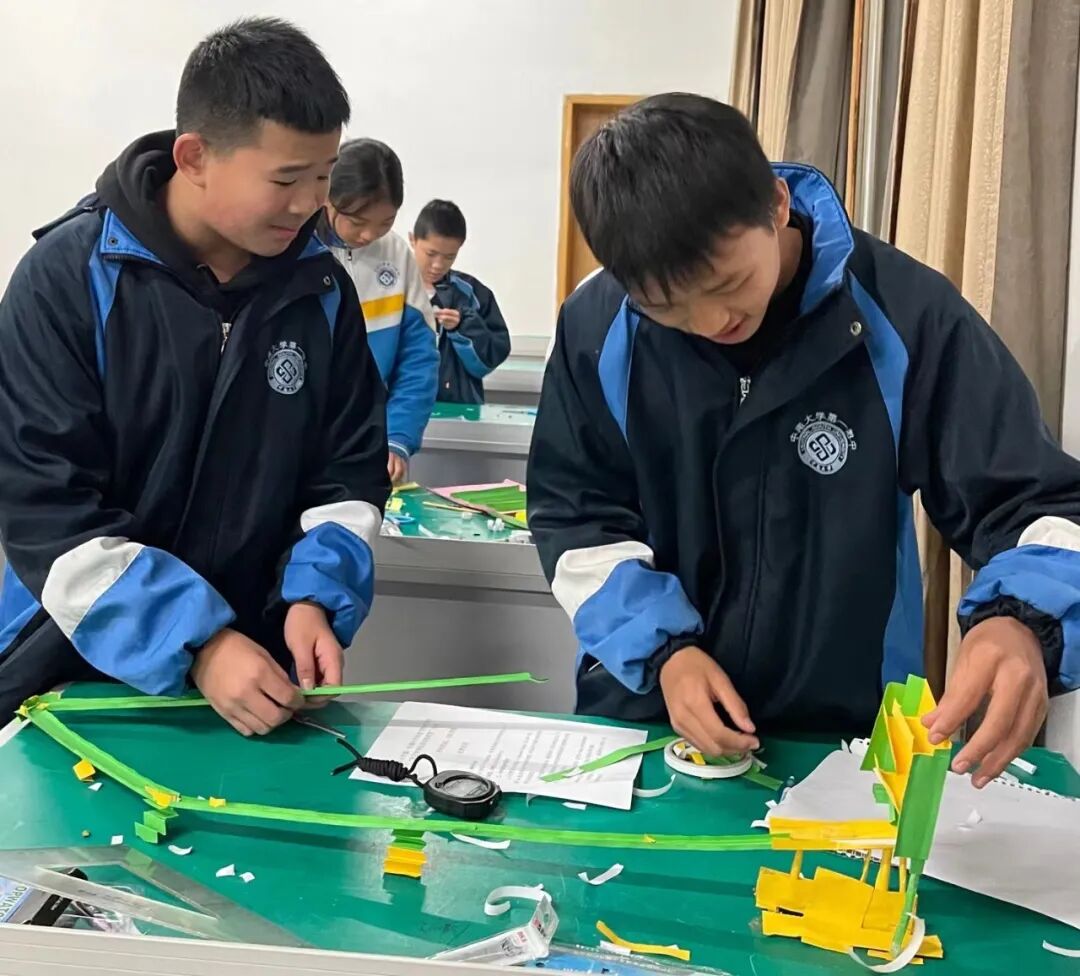 “奇思妙想纸质结构模型”,活动制作现场,选手们精心设计、认真研究、反复改造,制作出了形状各异的模型装置,有圆柱体的、有正方形的、还有斜面的,选手们在模型的设计、组装、调试环节皆一丝不苟,大家在不断尝试的过程中学会了发现问题、学会分享、学会改进。测试时小球在赛道上跌宕起伏,牵动大家心神的不仅是一次竞赛的成功,更是对科技魅力的无比向往。此次活动通过做中学、玩中学,既启发了学生乐于动手、勤于思考的意识,又在实践中养成独立解决问题的能力,也引导广大学生充分感悟科技模型的魅力,培养学生的科技创新能力与合作共赢意识。