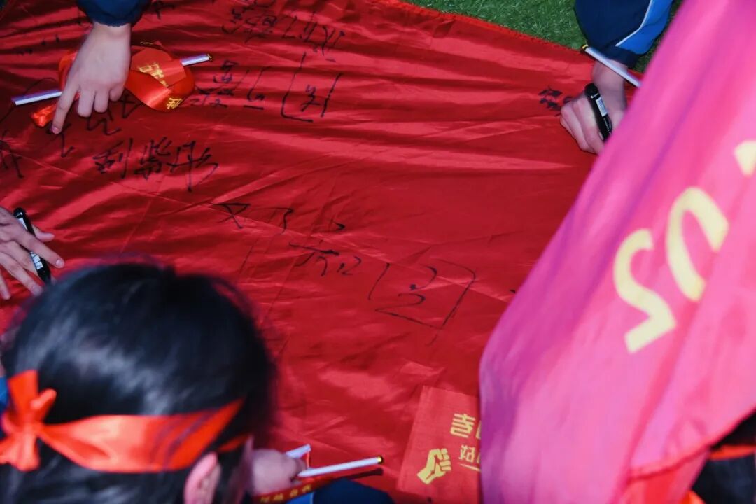 穿过成功门后,同学们在班旗上签下自己的名字和理想,一笔一画,见证了这一庄严而美好的时刻,为自己壮行。