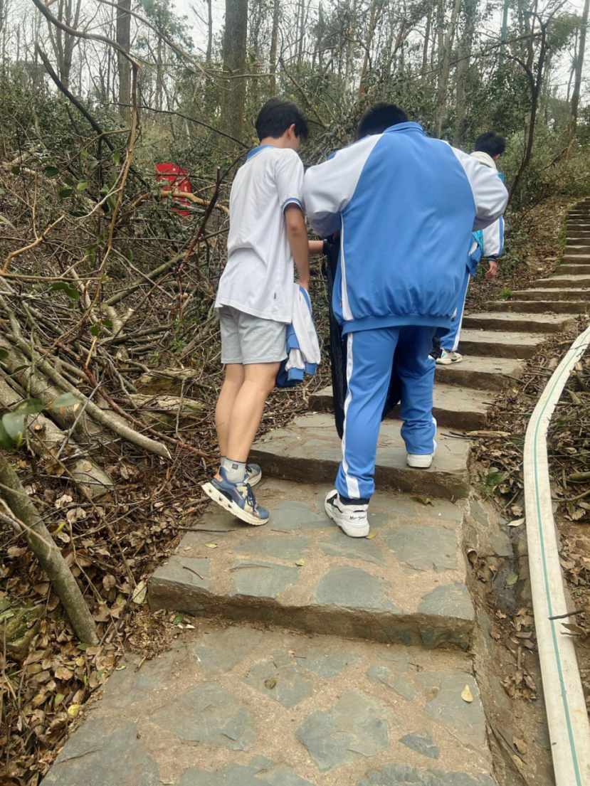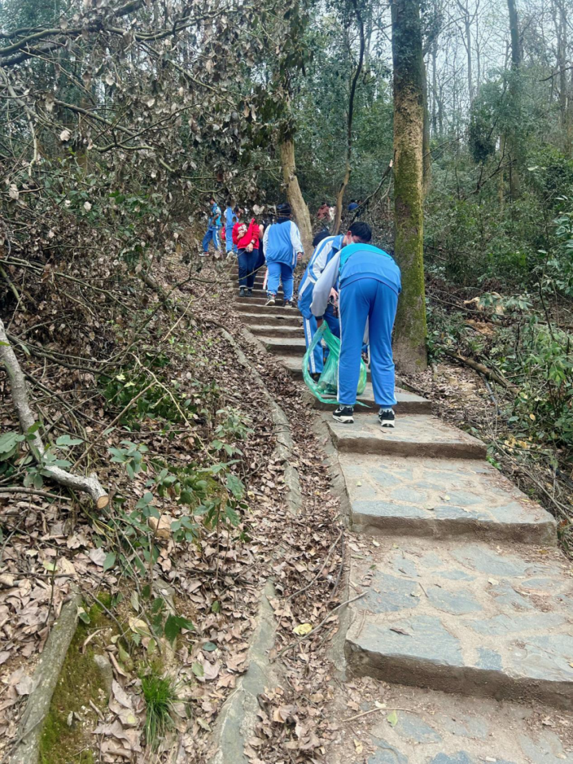 将校园及周边环境清理得焕然一新、整洁有序之后,同学们来到岳麓山清理山道垃圾。山路虽陡,但是阻挡不了同学们团结互助、热心奉献的友爱步伐。大家欣赏着沿途的美景,享受着爬山带来的乐趣,也带走了散落在山间不易降解的垃圾。每一个躬身弯腰的瞬间,都成为一道靓丽的风景线。