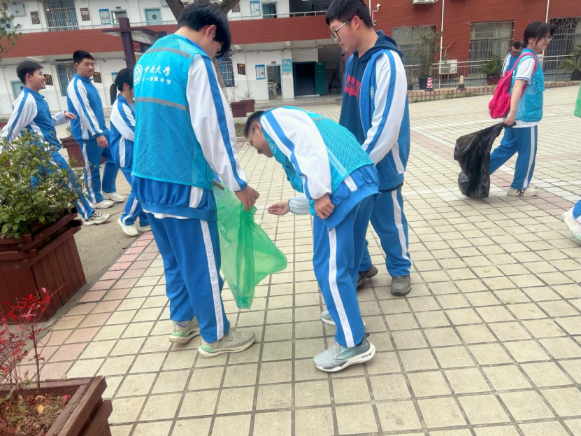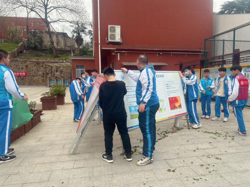 紧接着同学们就投入到热火朝天的垃圾清理活动中,他们有的拿着垃圾袋,沿着一附中校园小道拾掇垃圾;有的进入学校体育器材室整理器材,清扫地面;有的合力把被风吹落的校园宣传牌安装好......同学们把路面上以及树木丛中的白色垃圾、废纸片、树叶等废弃物进行了装袋清理,分工协作,配合默契,秩序井然。