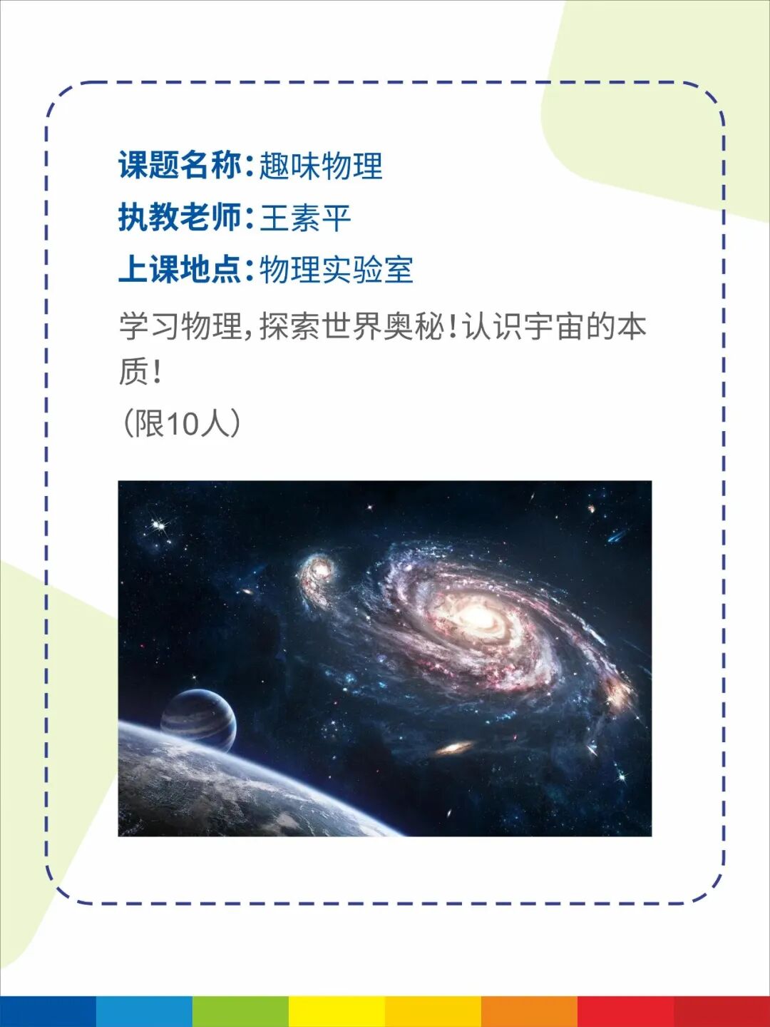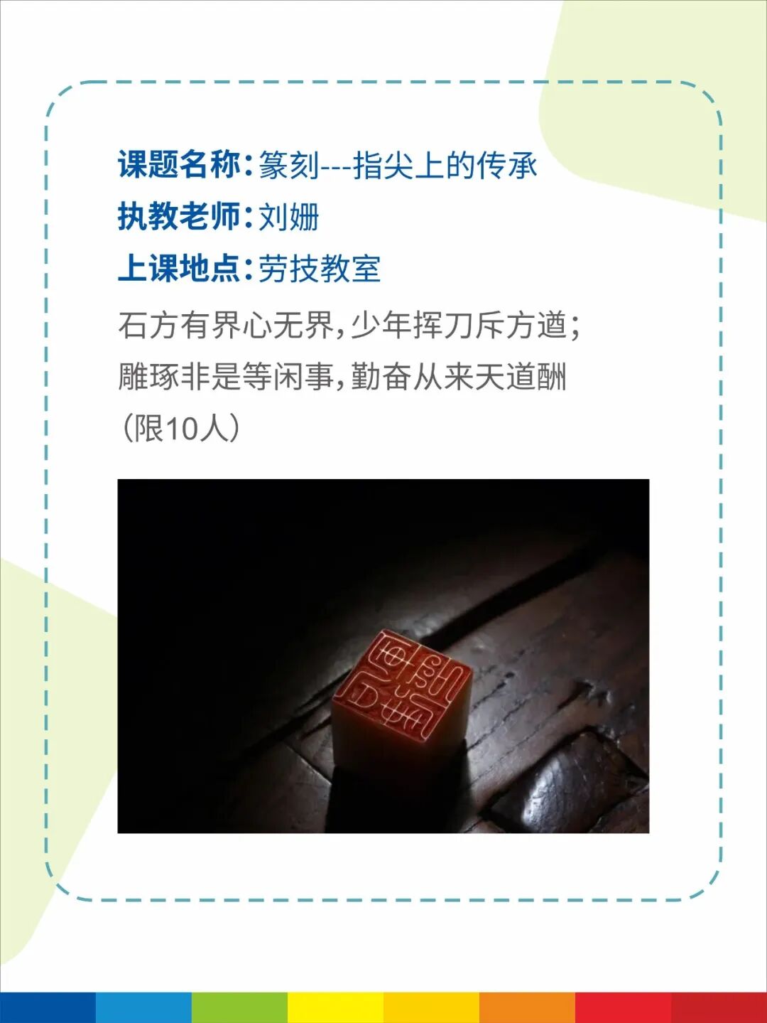 为了拓宽学生的学神视野,培养创新思维和实践能力,让他们在动手实验中探索科学奥秘,在艺体活动中发现美的力量,为全面发展奠定坚实基础。我校在初一年级开设拓展课,拓展课由学校根据教学总体情况设置,课程涵盖文化类课程、实验类课程、艺体类课程、心理学等,每学期开设两轮,每一轮提供九门左右的课程供学生选择。本学期第二轮拓展课开设以下课程: