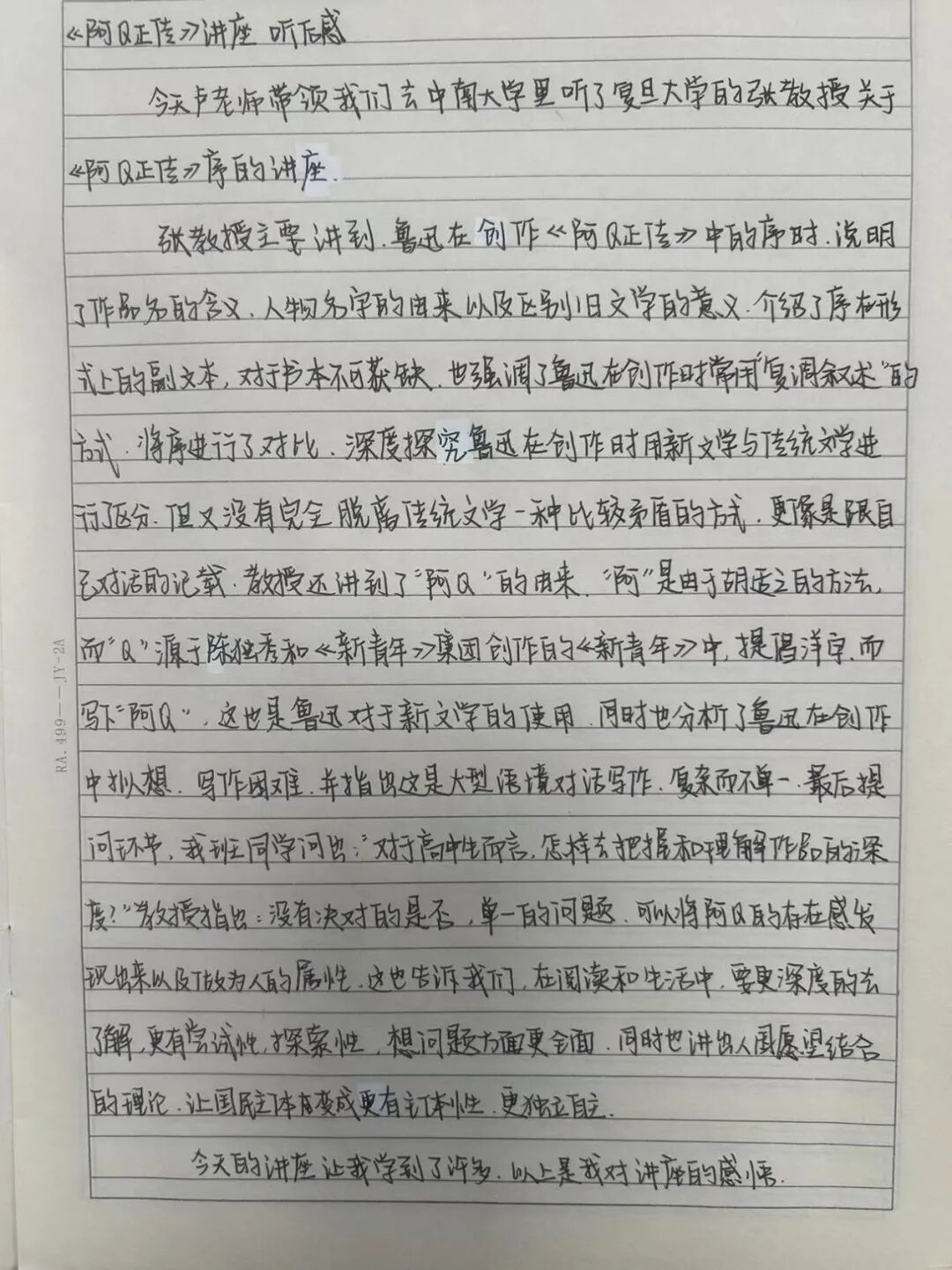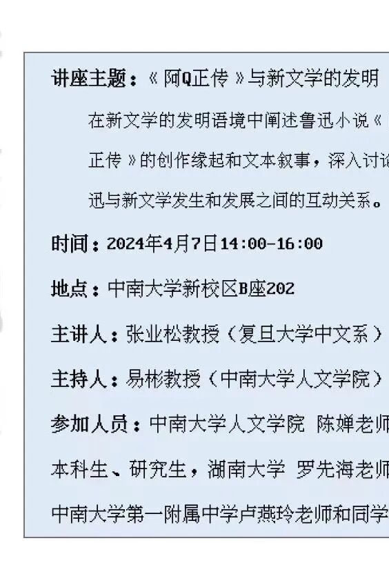 暖阳春风,书香满园。4月7日下午,中南大学人文学院特邀复旦大学中文系博士生导师张业松教授,为学院本科生和研究生带来了一场主题为“《阿Q正传》与新文学的发明”讲座活动。我校组织高一师生在年级组长卢燕玲老师的带领下参加讲座学习。