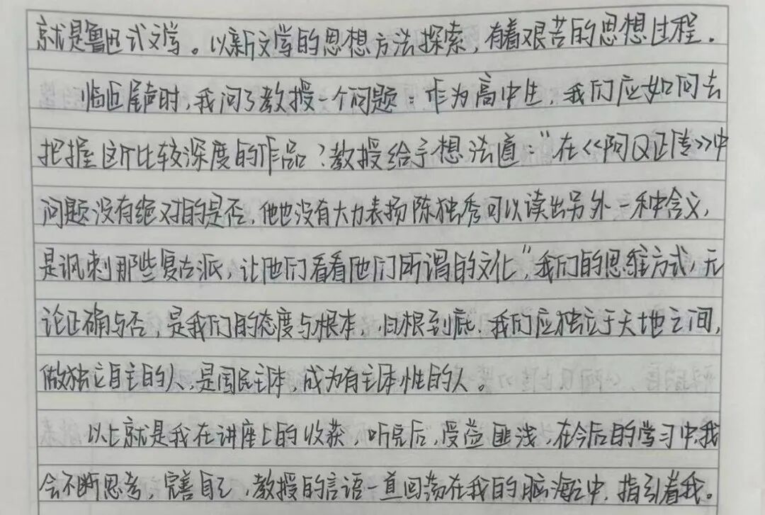 在互动交流环节,张业松教授对师生代表的提问也做出了细致认真的回答,让学生从多个角度了解鲁迅先生的新文学创作特点和方法。我校张思琪同学提出“高中生应该如何去把握和理解《阿Q正传》的深度”这一问题,得到张教授热情深入指导,并且还得到了他亲笔签名的研究专著《鲁迅文学的内面——细读与通讲》。