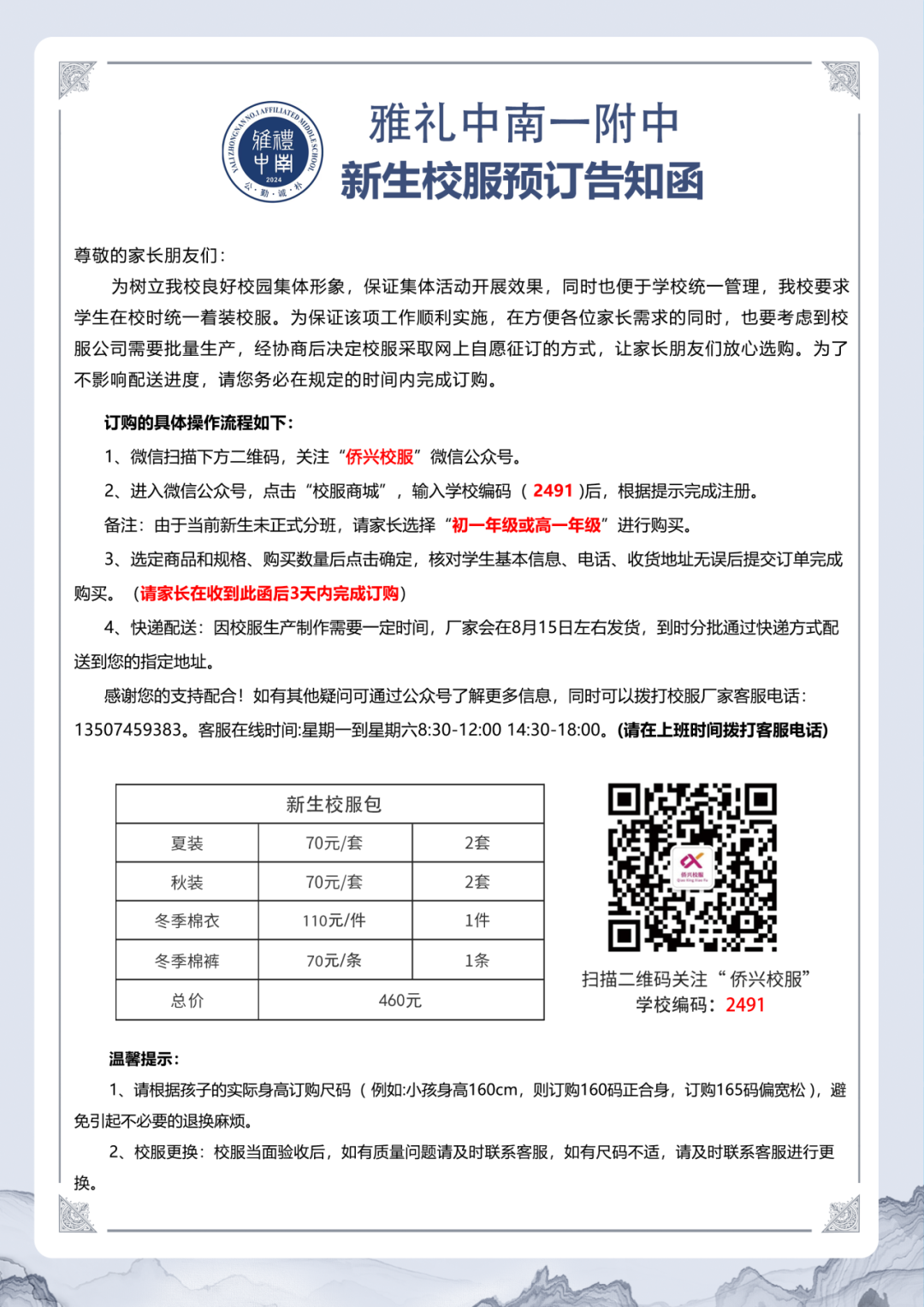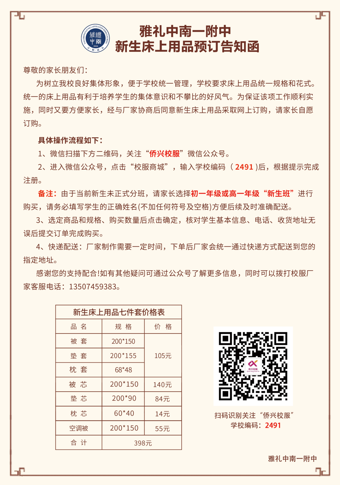 欢迎加入雅礼中南一附中大家庭,现发布校服和床上用品预订通知,请大家认真阅读,及时网上预订。