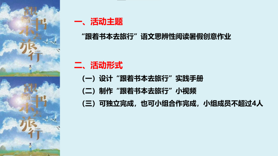 暑假伊始,语文组的老师向孩子们发出了活动倡议并公布了活动要求,号召孩子们从书本出发,跟着古今名家在行走中欣赏祖国河山的壮美,感受中华文化的魅力,同时更要用自己的眼看世界,用自己的心悟美景,从而收获自己独特的旅行感受。