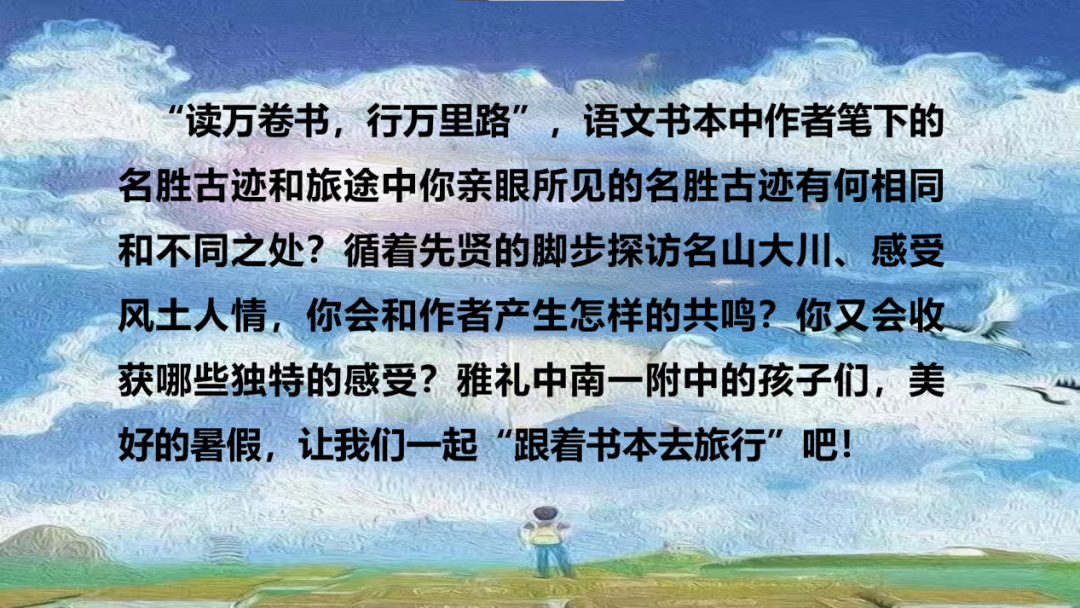 为了培养学生的思辨能力,彰显“大语文”的教学观;为了让同学们身临其境地感知中华文化,识自然,看建筑,赏文物,学地理,读历史,让陈列在书上的知识和分布在广袤大地上的美景“活”起来;更为了增强同学们的国家荣誉感和文化自信,雅礼中南一附中语文组的老师们在暑假期间给同学们布置了一项独具特色的思辨性阅读作业——“跟着书本去旅行”。