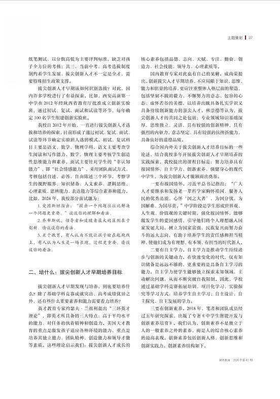 当前,拔尖创新人才的早期选拔存在的主要问题如下:其一,学校不清楚拔尖创新人才的早期特征,对此缺乏系统研究,而将其简单归结为成绩好,特别是数学成绩好;其二,选拔流程简单,大多为纸笔测试,以分数高低为主要评判标准,缺乏对孩子全方位的考核;其三,当前中考、高考选拔制度制约着学生发展,拔尖创新人才不一定是全才,需要特殊招生政策支撑。