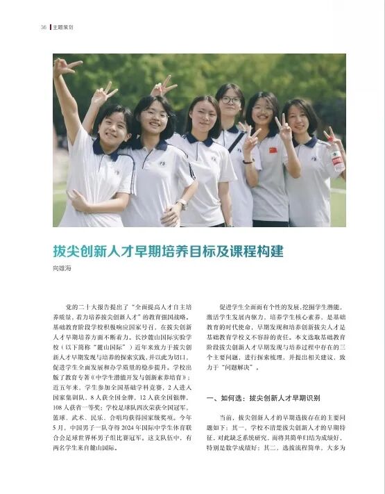 党的二十大报告提出了“全面提高人才自主培养质量,着力培养拔尖创新人才”的教育强国战略。基础教育阶段学校积极响应国家号召,在拔尖创新人才早期培养方面不断着力。长沙麓山国际实验学校(以下简称“麓山国际”)近年来致力于拔尖创新人才早期发现与培养的探索实践,并以此为切口,促进学生全面发展和办学质量的稳步提升。学校出版了教育专著《中学生潜能开发与创新素养培育》;近五年来,学生参加全国基础学科竞赛,2人进入国家集训队,8人获得全国金牌,12人获得全国银牌,108人获省一等奖;学校足球队四次荣获全国冠军,篮球、武术、民乐、合唱均获得国家级奖项。今年5月,中国男子一队夺得2024年国际中学生体育联合会足球世界杯男子组比赛冠军。这支队伍中,有两名学生来自麓山国际。