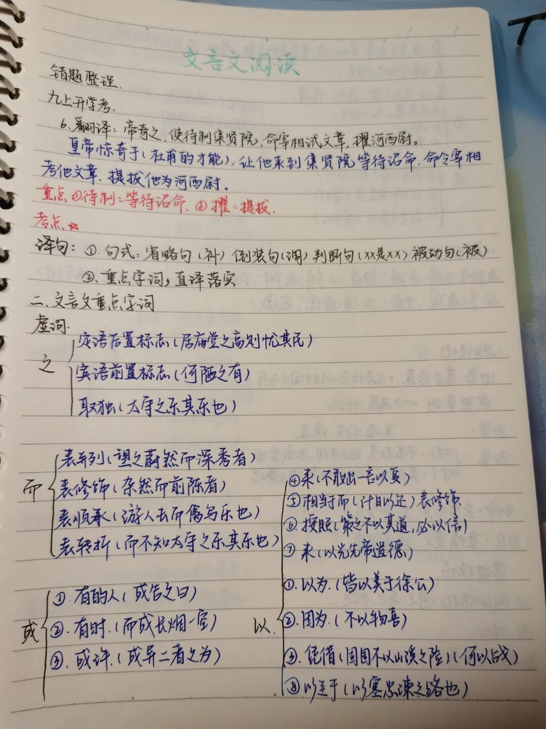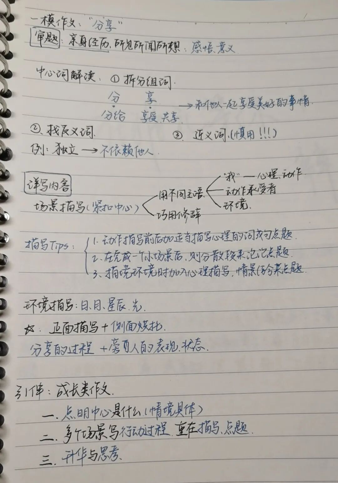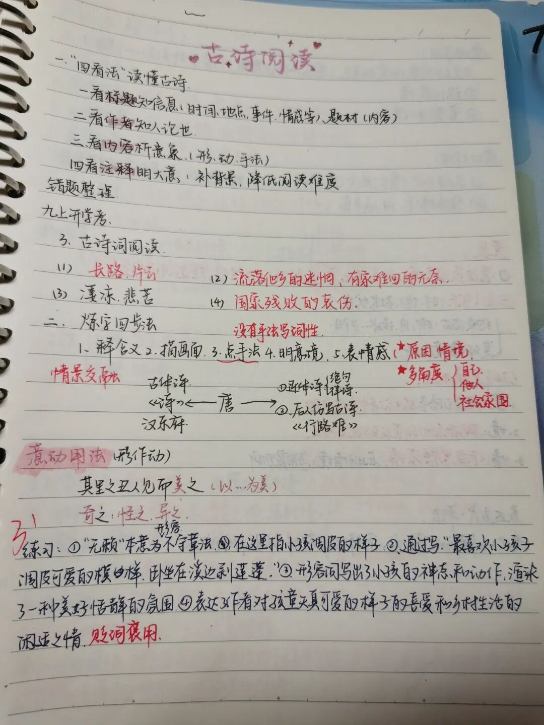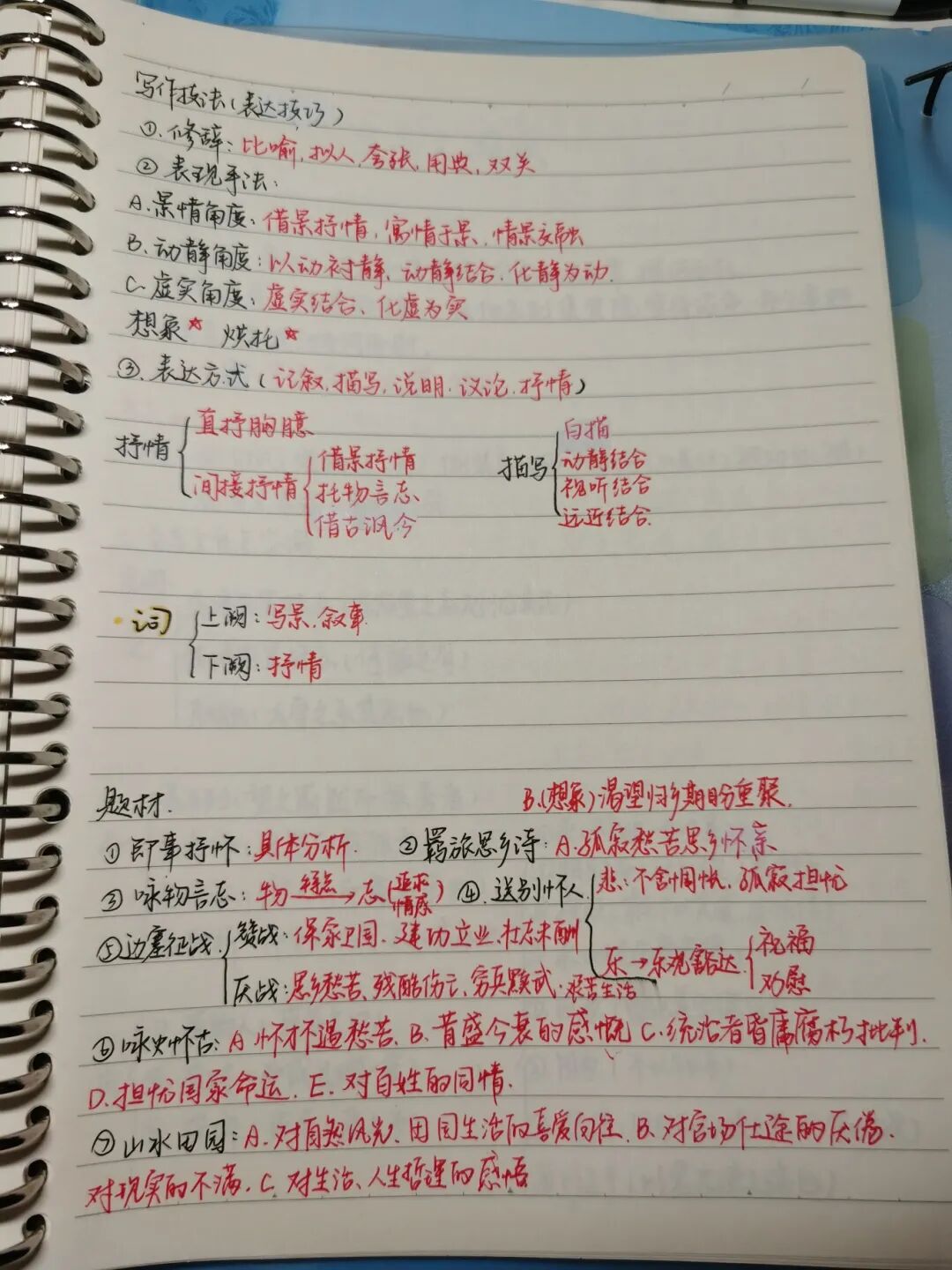 第二部分是理解与表达,主要包括古诗鉴赏,文言文阅读和现代文阅读。古诗阅读可运用“四看法”,①看标题知信息(时间、地点、事件、情感基调等)②看作者知人论世,结合作者生平理解诗词情感。③看内容析意象(手法)。④看注释明大意,补充背景信息的同时降低了阅读难度。对于晦涩难懂的文言文,我的方法是将所学知识进行整理和归纳。例如这个文言实词在这篇文章中是这个意思,在另一篇文章中又是另一个意思,那么就要将两者记下来。总结,归纳起来,便于我们记忆和复习。而对于现代文阅读,平常的做题和考试中会积累到一些答题模板,但切忌生搬硬套!答题时要注意结合文章内容进行灵活变通,多写多练。以上这三个板块在进行答案校对时,不用将大段的解析全部抄下来,而是着重记录下你没有答到的点,概括答案内容,重点关注手法、意象、情感、主旨等关键词,就可以节省很多时间。
