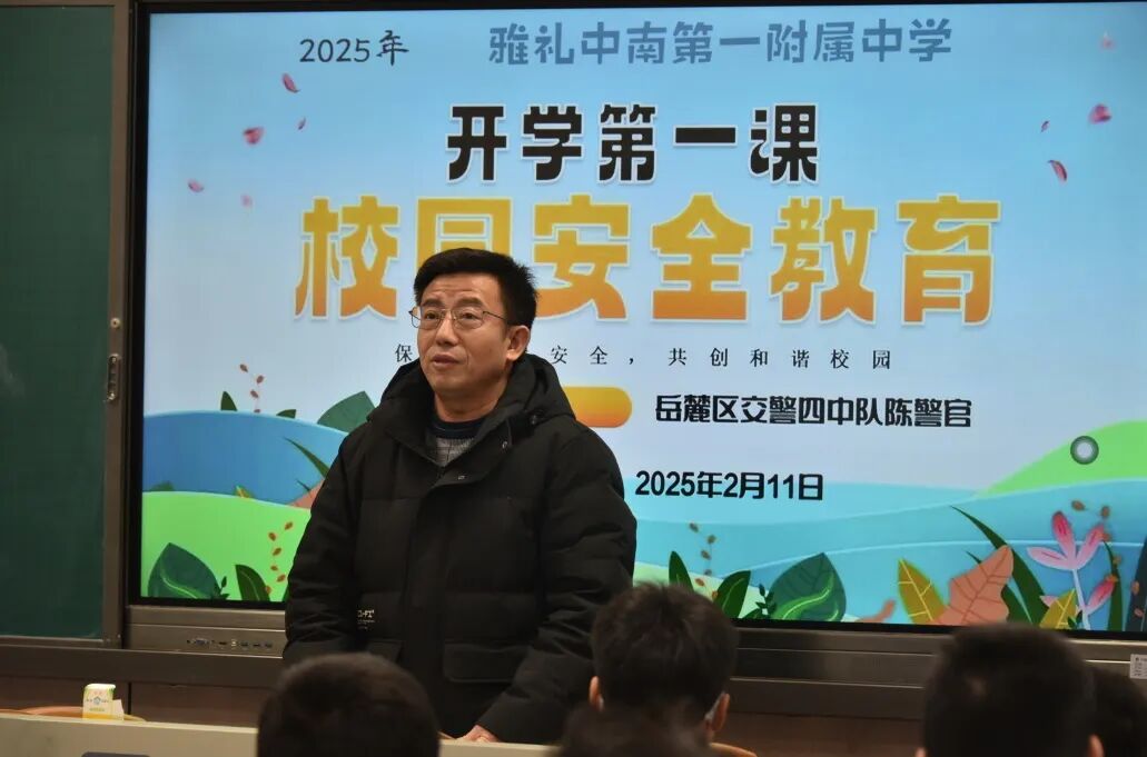 活动伊始,虢校长发表致辞。他代表全体师生向岳麓区交警大队四中队的陈警官表达了热烈欢迎与诚挚感谢。虢校长指出,安全是生命的基石、成长的底线和幸福的保障,校园不仅是知识的殿堂,更应是守护生命、培育责任的港湾。鉴于网络诈骗、校园欺凌、交通事故等频发,学校重视安全教育,邀请警官开展面对面宣讲,为学生筑牢安全防线。此次邀请专业警官进校园,通过面对面宣讲、零距离互动,旨在为同学们敲响安全警钟,筑牢防范之墙。未来学校将与公安部门合作,开展防欺凌、反诈骗等活动,构建 “教育 + 预防 + 保护” 的安全网络,营造良好成长环境。