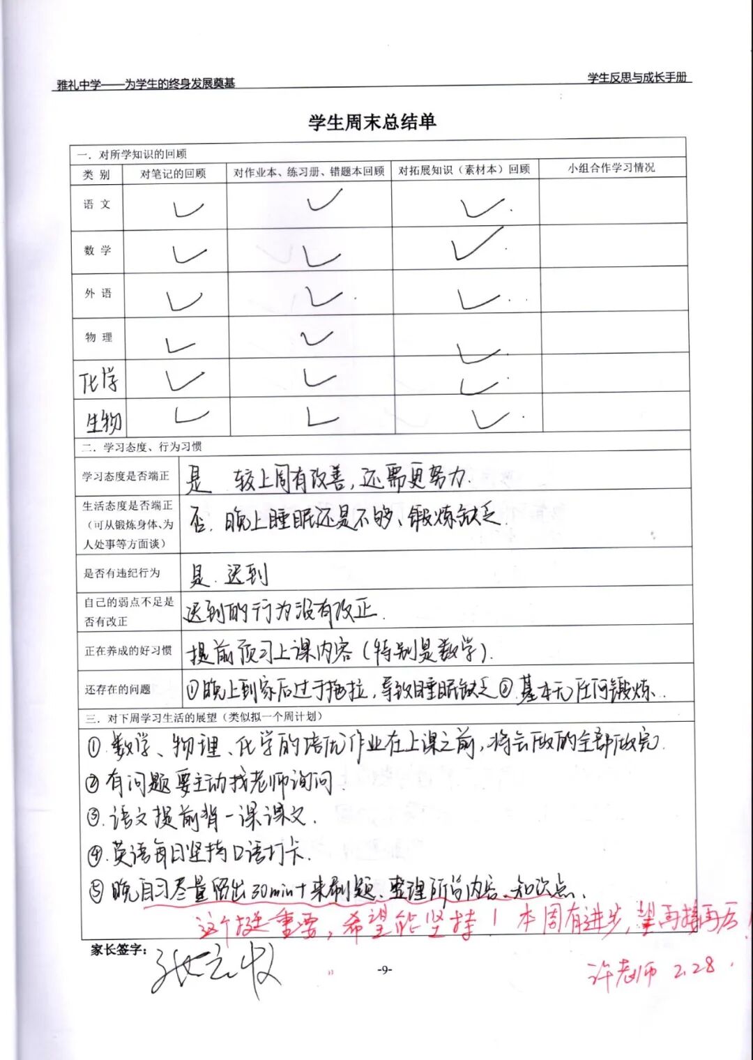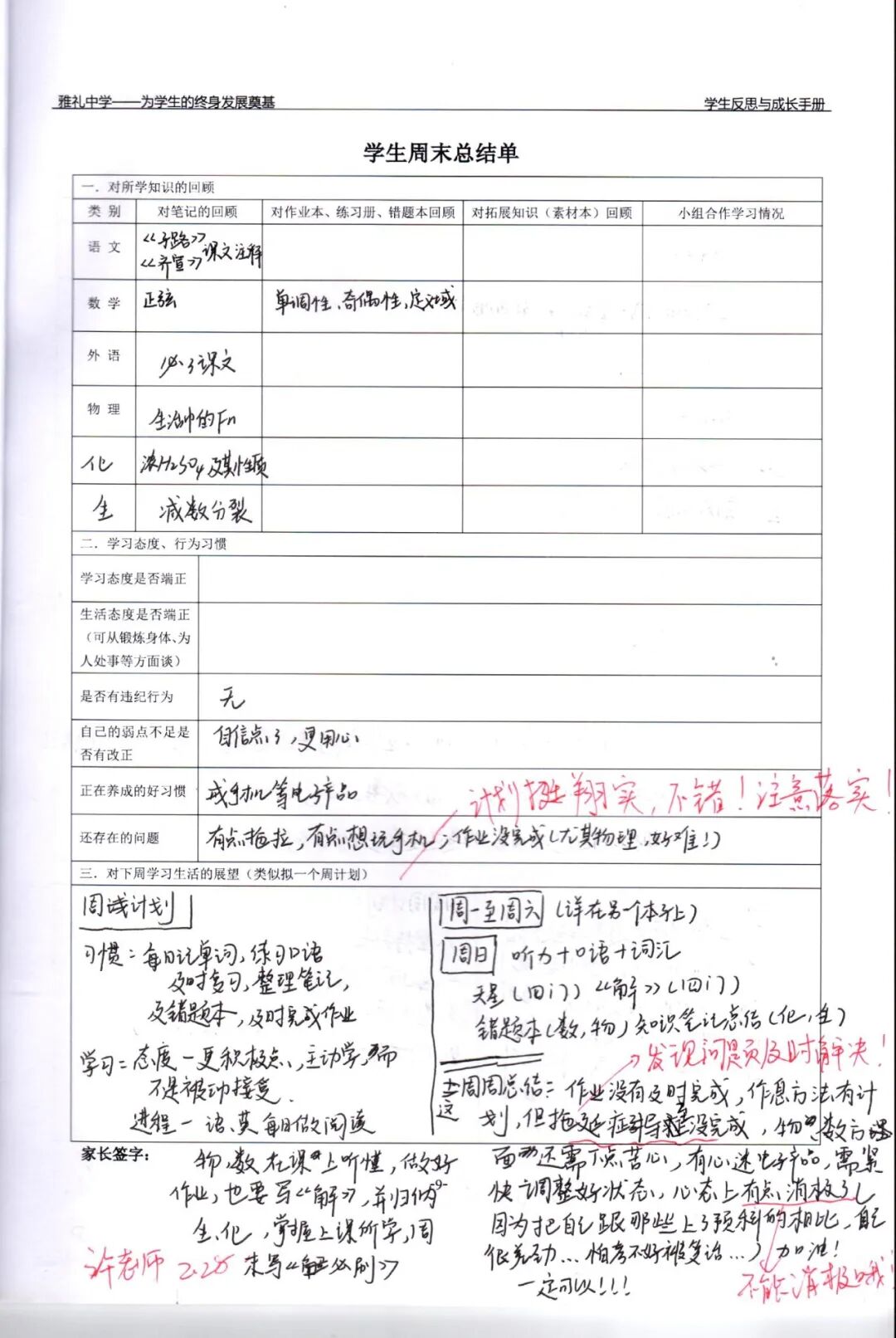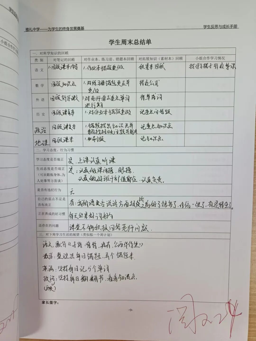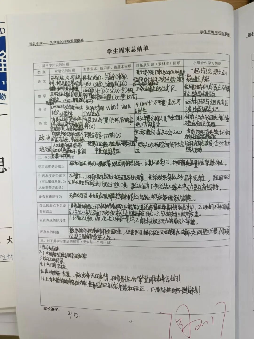 良好的学风是学习的有力保障。开学之初,年级组便制定了严格的班规,并邀请家长签字确认,家校携手,为学生的成长保驾护航。各班的日常行为规范登记手册,时刻督促同学们养成良好的习惯;周末反思和成长手册,则帮助同学们总结一周的学习与生活,在反思中不断进步。