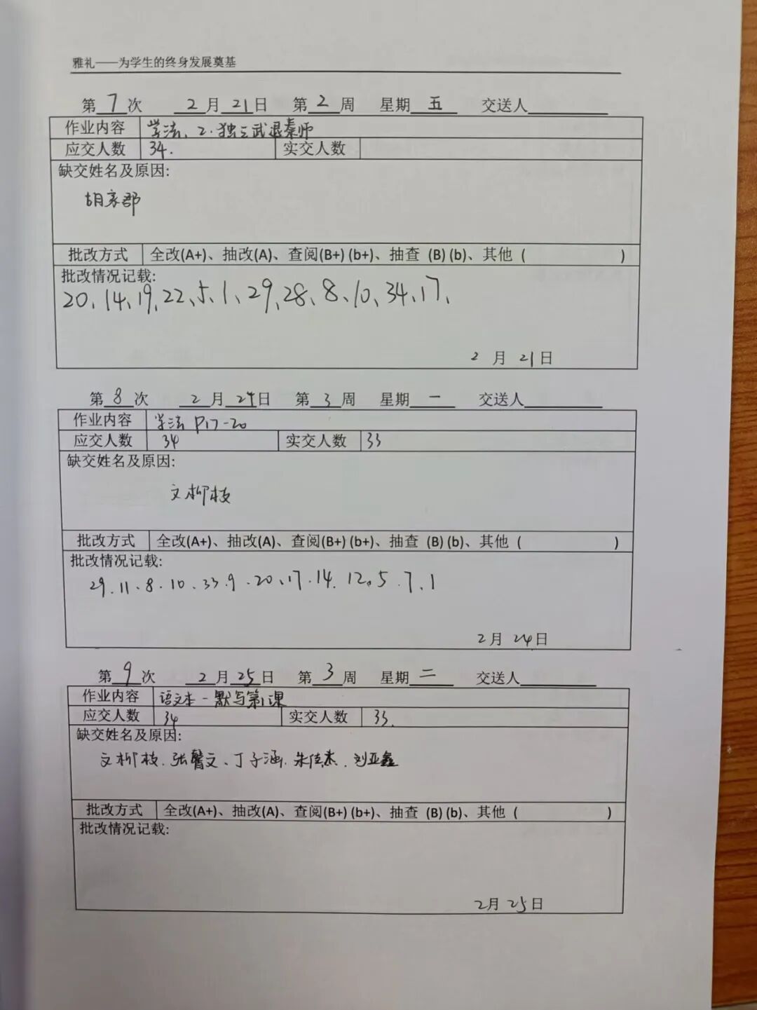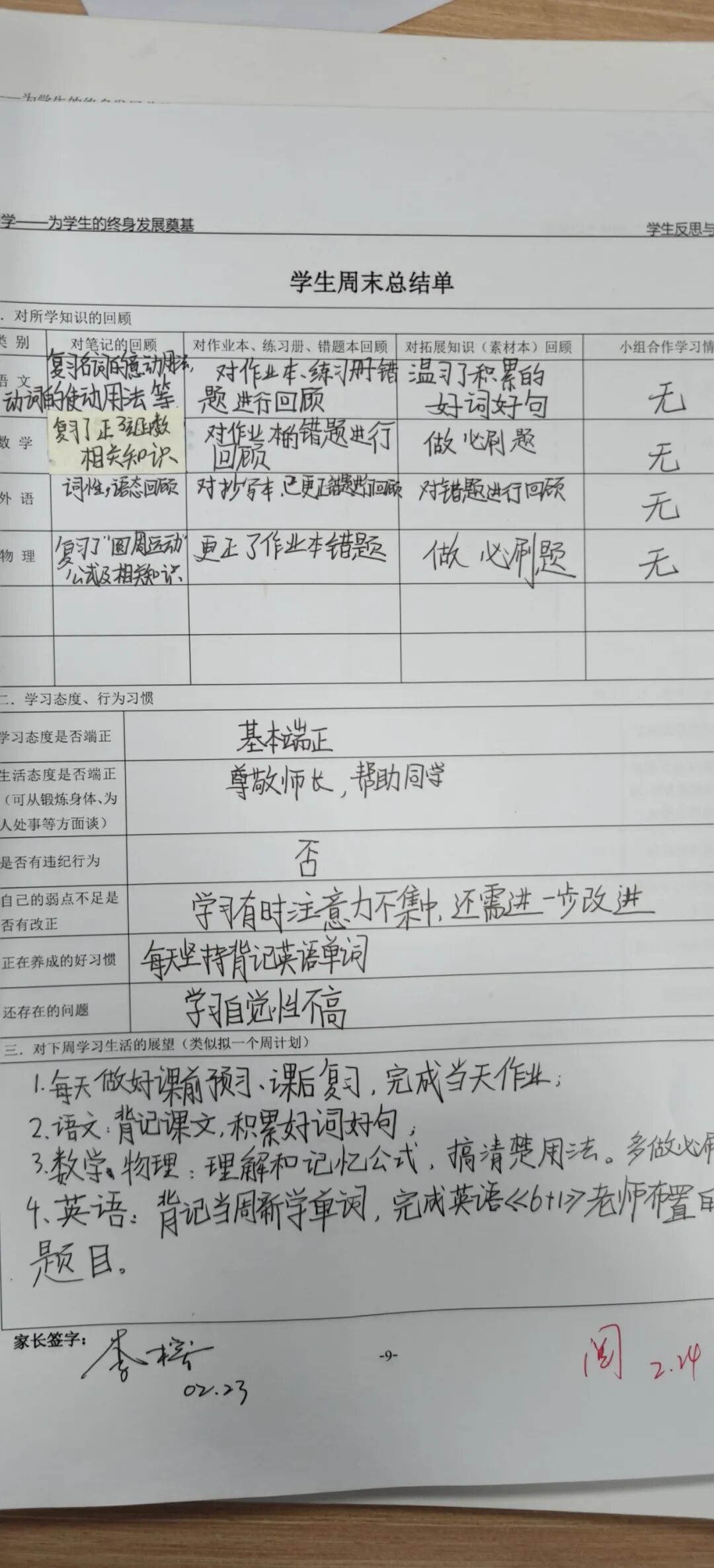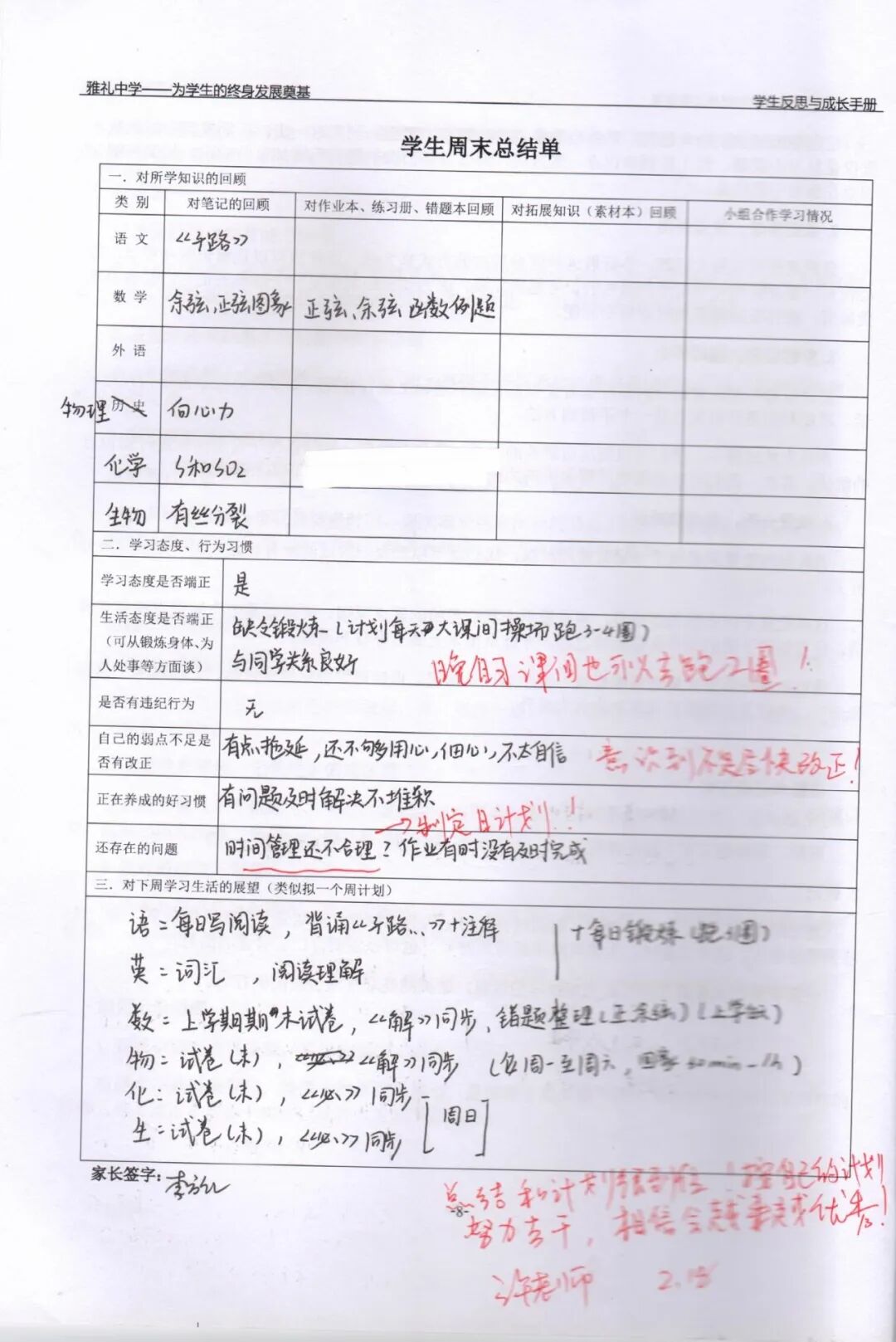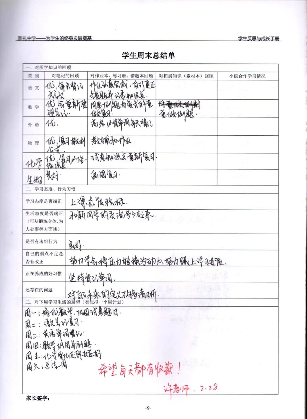 良好的学风是学习的有力保障。开学之初,年级组便制定了严格的班规,并邀请家长签字确认,家校携手,为学生的成长保驾护航。各班的日常行为规范登记手册,时刻督促同学们养成良好的习惯;周末反思和成长手册,则帮助同学们总结一周的学习与生活,在反思中不断进步。