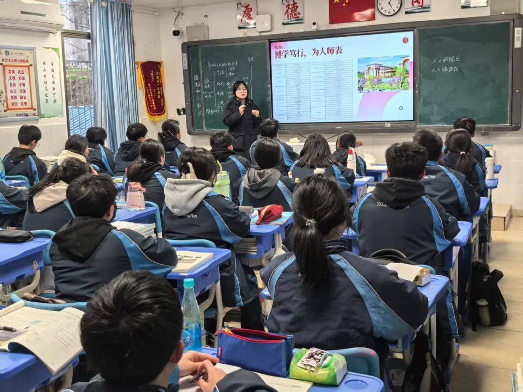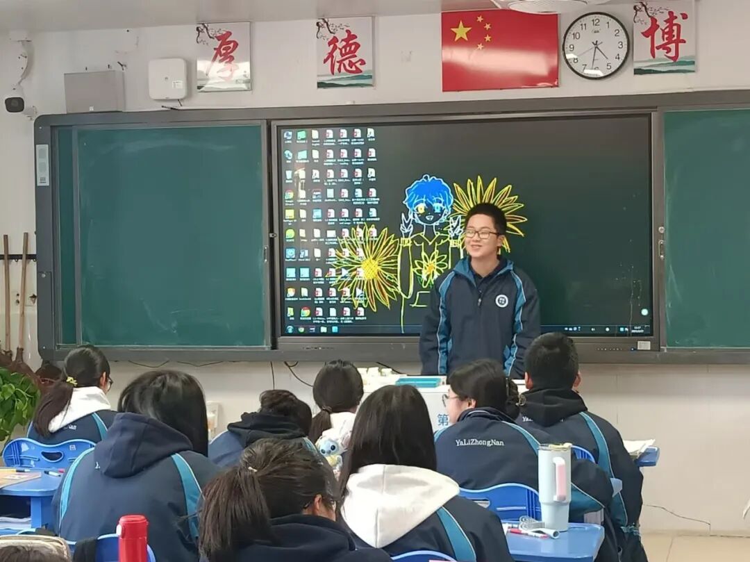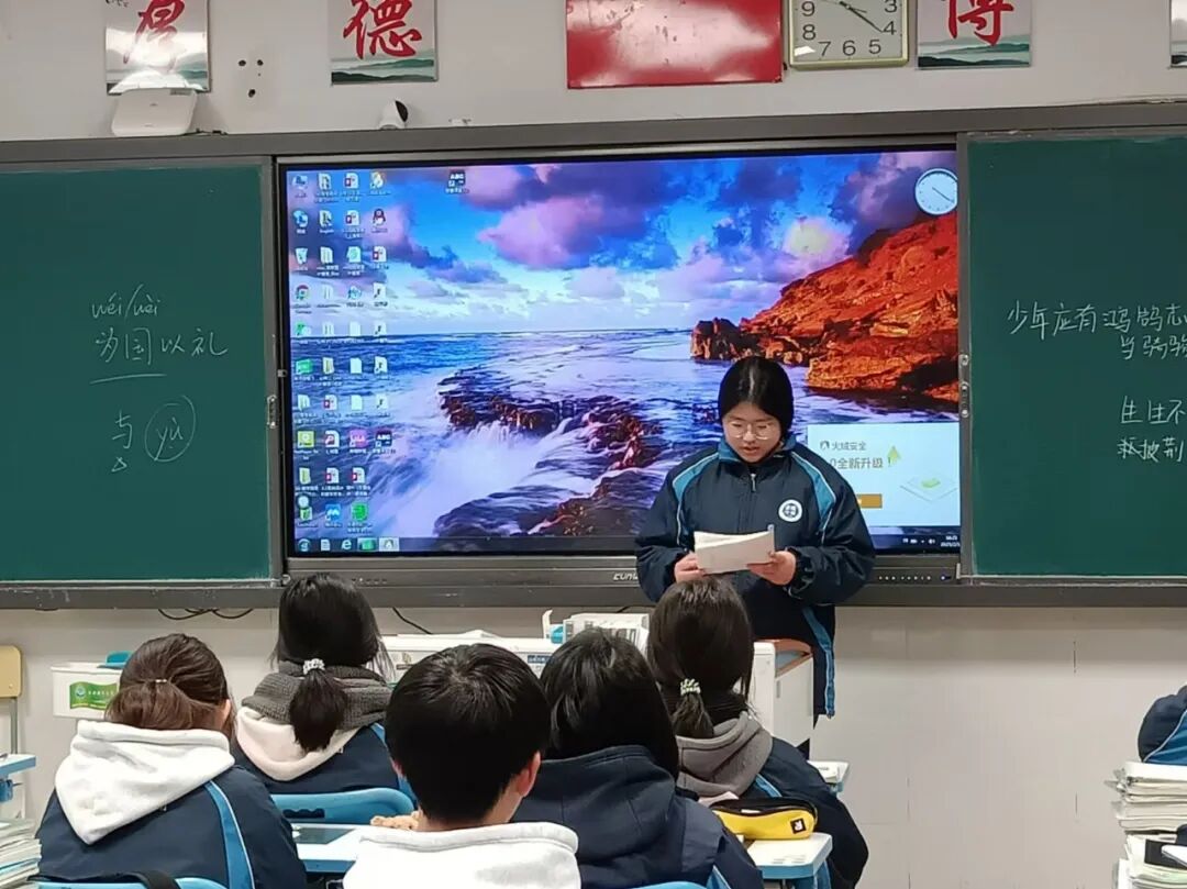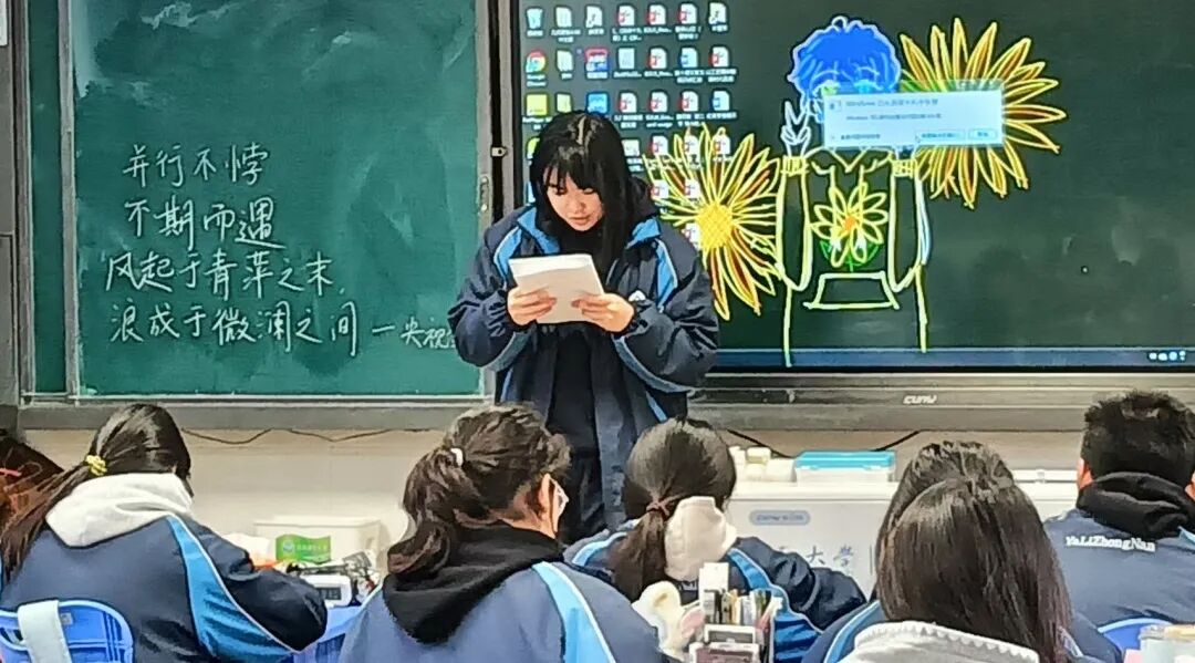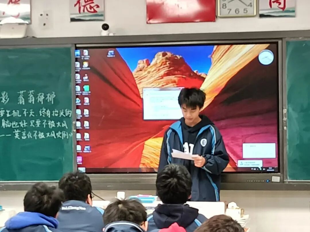 课堂上,同学们全神贯注,积极参与互动,思维的火花不断碰撞,三尺讲台化作星火燎原之地。老师们运用丰富多样的教学方法,将复杂的知识讲解得生动有趣,易于理解。语文课的晨钟暮鼓中,成语典故在唇齿间绽放千年智慧;数学符号跃动成思维的圆舞曲,物理公式勾勒宇宙的肌理。其中,每日语文课前的五分钟分享最受期待,内容或是成语典故,或是名人名言。这一环节不仅拓宽了学生的知识面,更培养了他们的自信,让学生成为课堂的主人。
