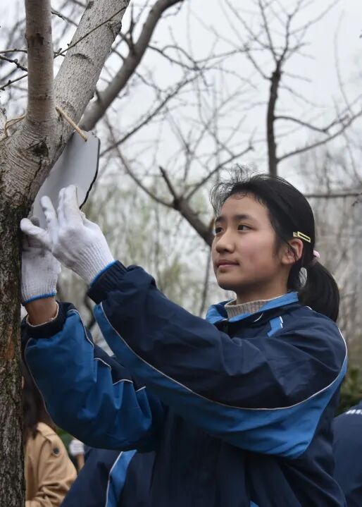 除此之外,“树联未来”智慧护绿活动也在如火如荼地进行。师生们为新植树木挂上定制二维码铭牌,并拍摄360°照片,录入苗木信息库,建立绿化生态数据库。这一创新举措不仅为树木的养护提供了便利,也为校园绿化管理增添了科技含量。