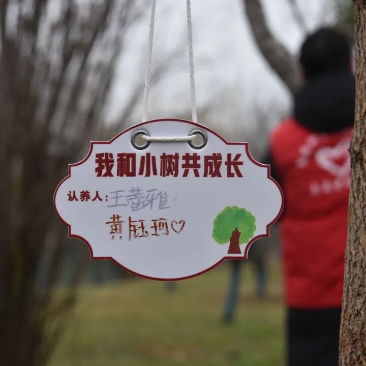 活动接近尾声时,学生们共同悬挂“我与小树共成长”标识牌,更加深刻地体会到保护环境、爱护树木的责任。