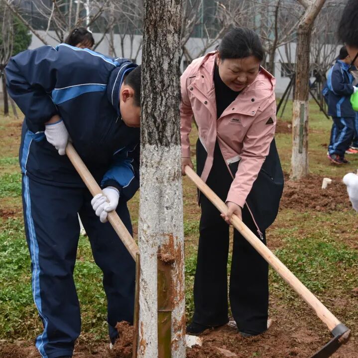 在植树实践环节中,师生们满怀热情,在志愿者的引导下自由组合成5-10人的小组,并制订了明确的分工。他们辛勤地填土、浇水,每一棵树苗都承载着师生们的希望与祝福。与此同时,虢校长也加入了植树的队伍,将学生们的热情推向高潮。