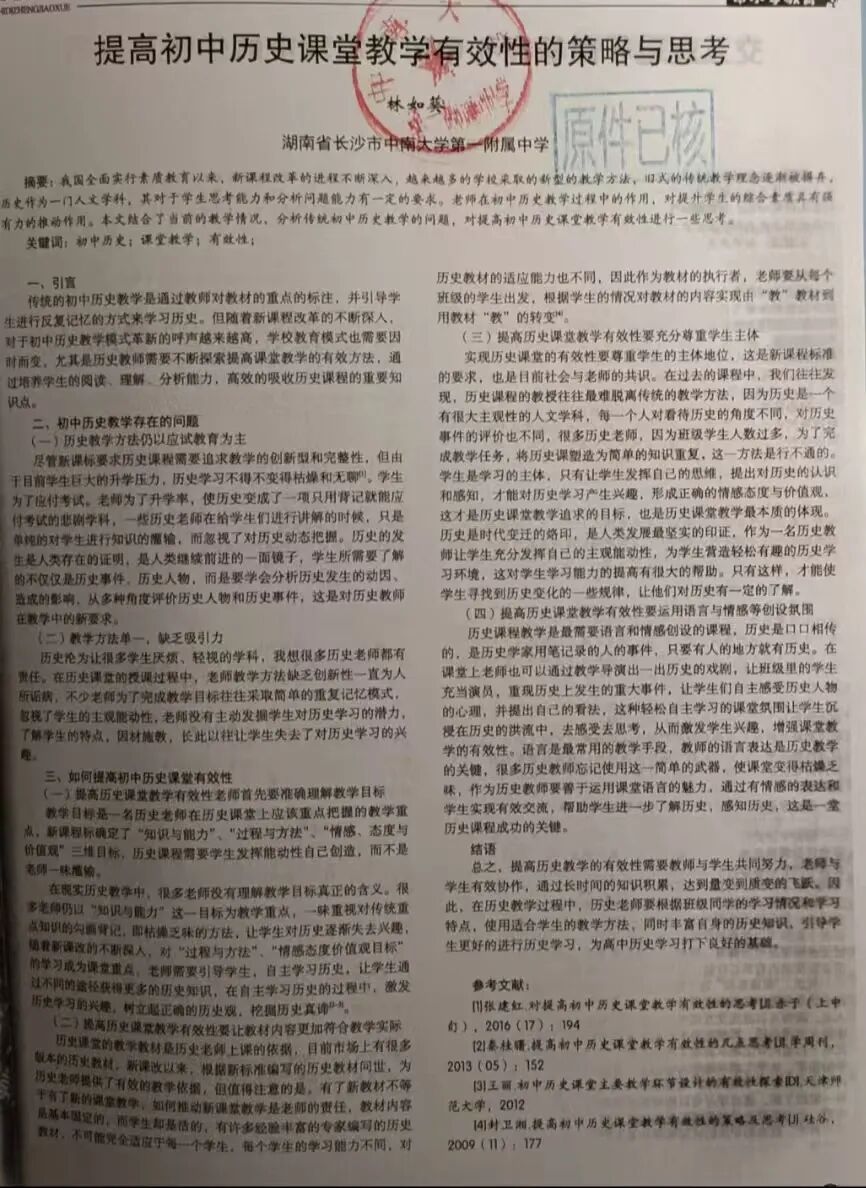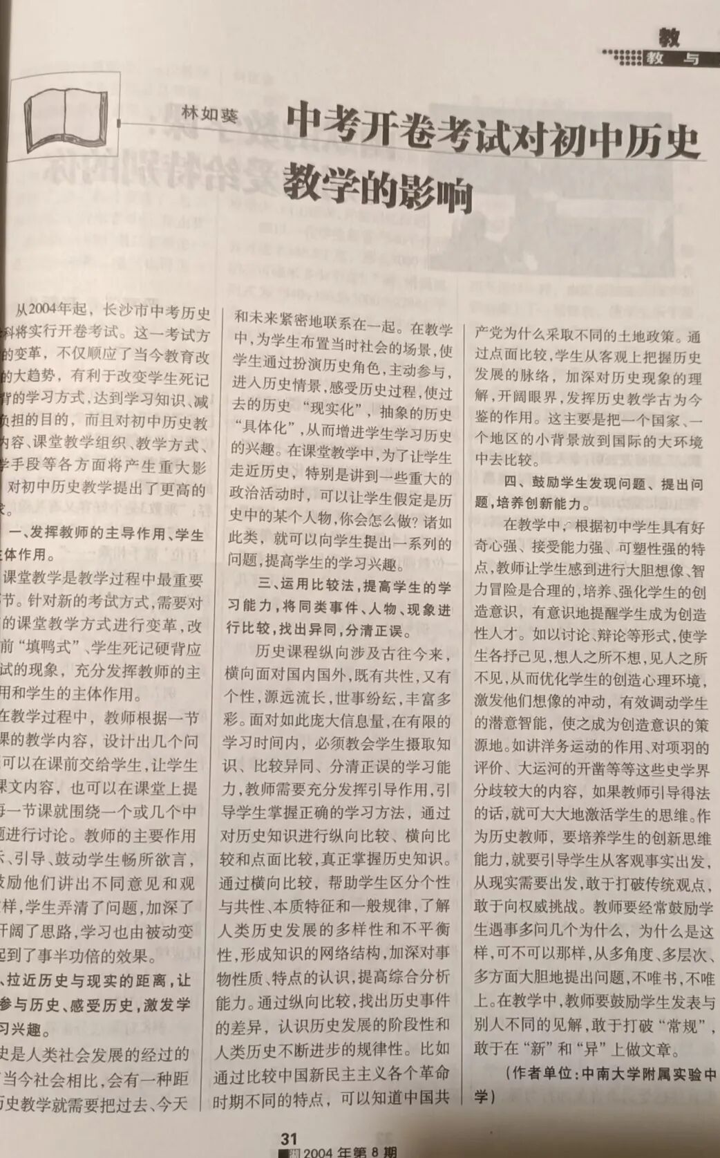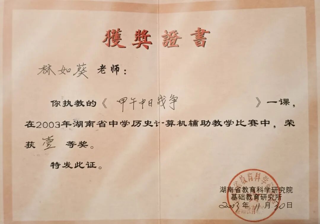 林老师积极参加各级培训及教研活动,与同行交流,借鉴优秀教学方法,积累教学经验,在《湖南教育》等期刊上发表论文,参加了湖南省教育科学研究院组织编写的九年级《历史基础训练》。