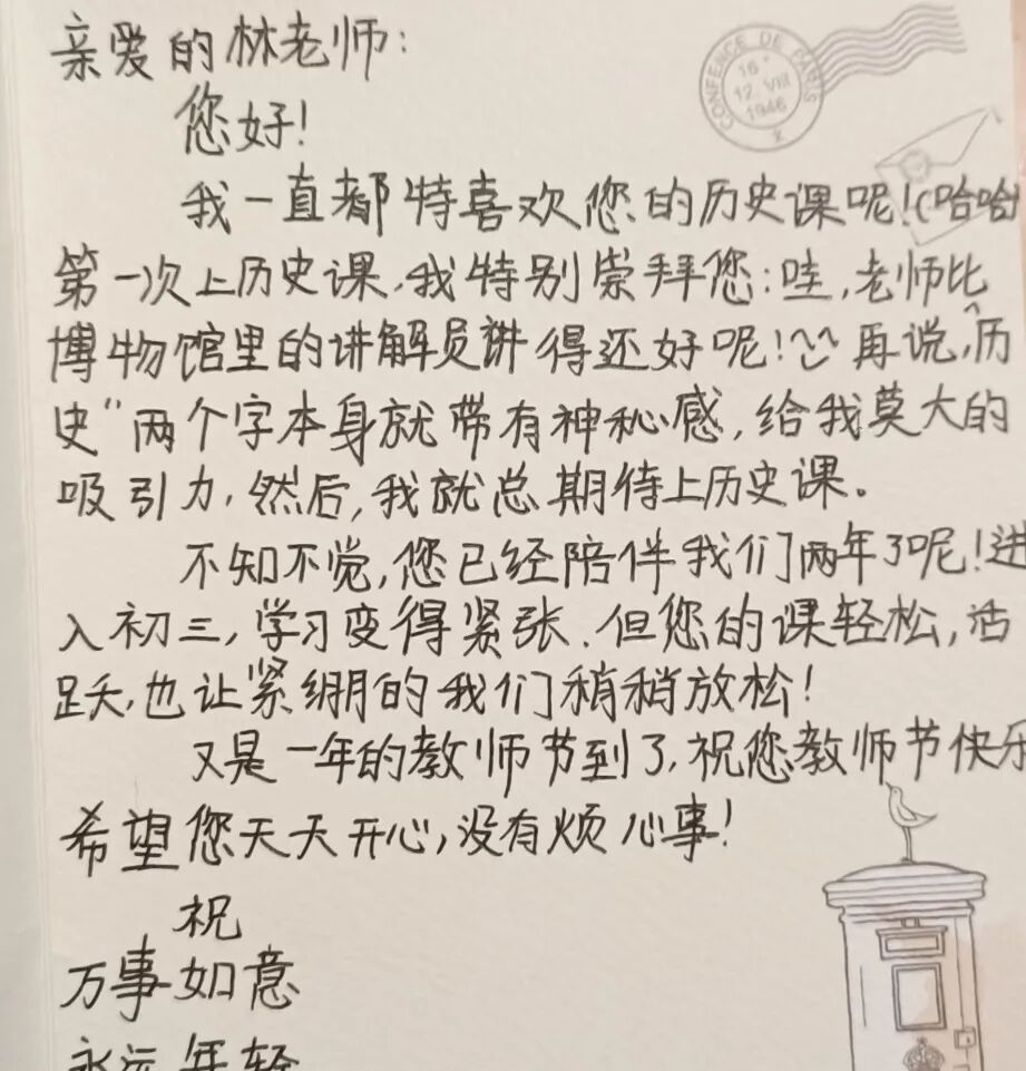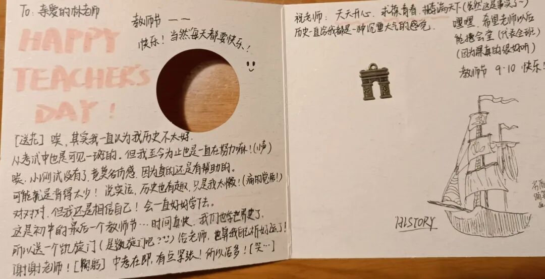 历史是一个民族一个国家的记忆,中学历史教育也是增强民族自信心的重要手段。林老师非常重视培养学生的历史文化素养,在初中年级开设了历史拓展课——仿制文物,配合学校的校园文化活动,组织学生开展“寻找家庭宝藏 触摸历史真实”、“找寻身边的历史”等多种活动,激发学生的学习兴趣。
